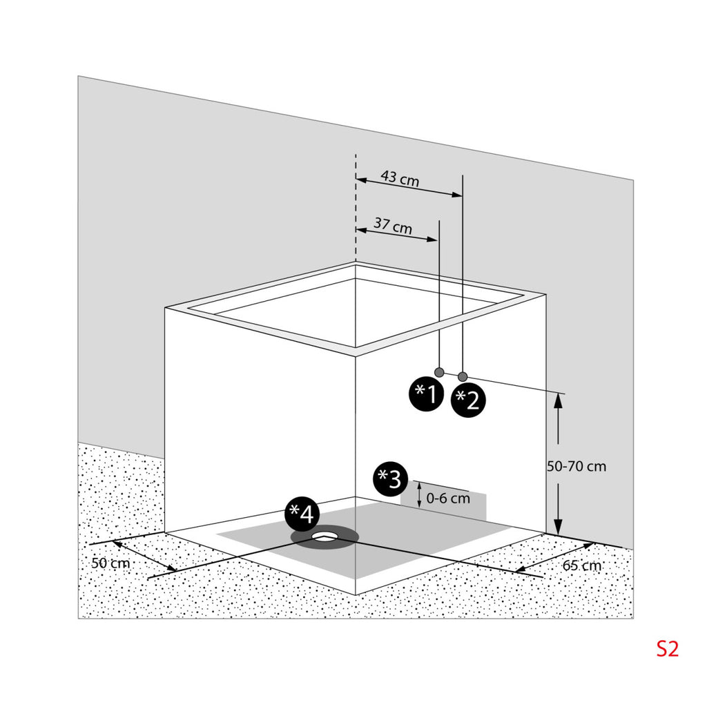 - Anschluss-Maße (Skizze S2): *1 Warm- und *2 Kaltwasser, auch gegenüberliegend möglich, *3 Bereich für Abflussrohre, *4 freier Bereich um den Abfluss-Siphon