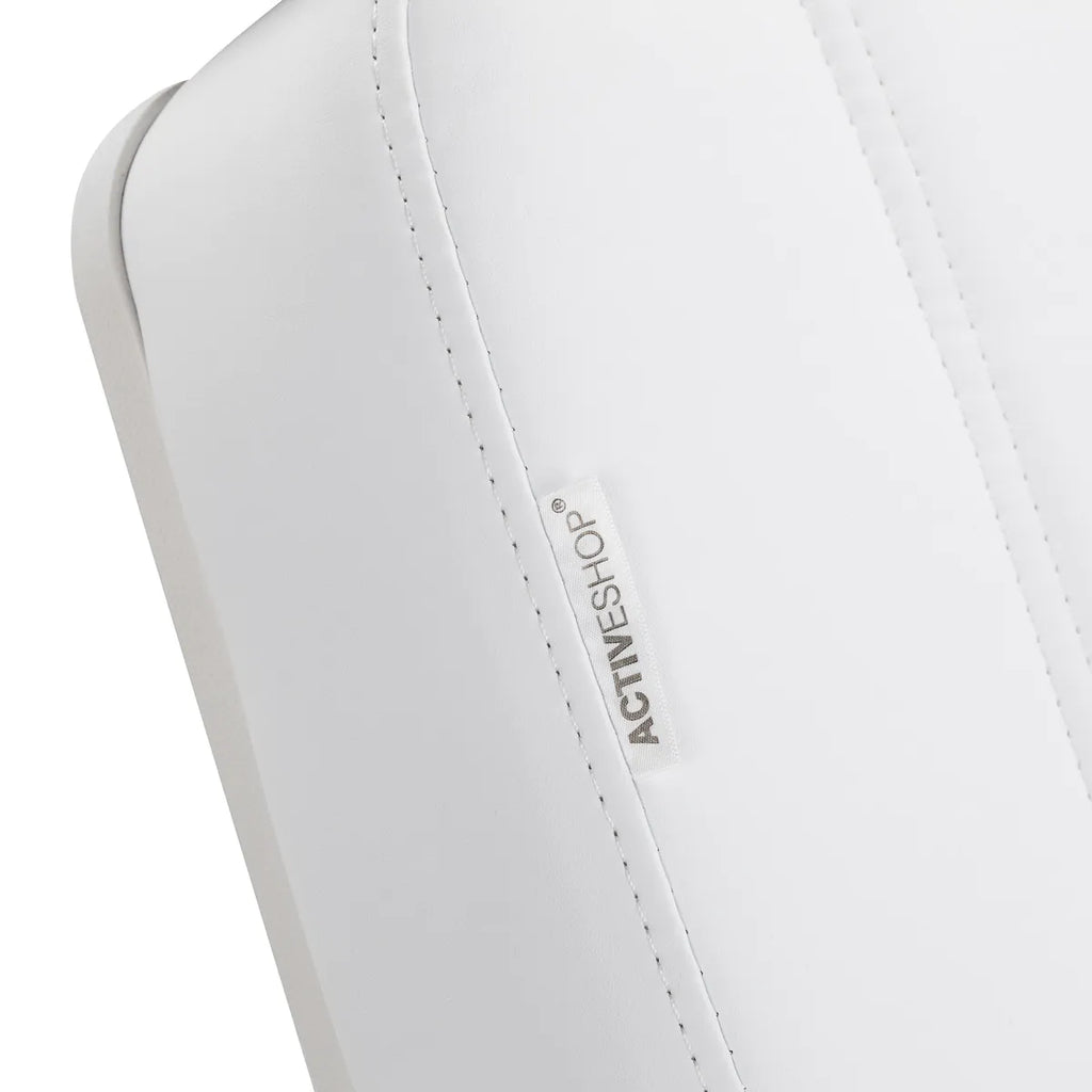 Die solide Konstruktion des Stuhls sorgtfür Stabilität und Langlebigkeitim täglichen Gebrauch. Der Sitz ist mit Schaumstoff in entsprechend ausgewählter Härte gefüllt undgarantiert Komfort auch bei Langzeitbehandlungen. Die Polsterung aus angenehm anzufassendem Kunstleder in Weißtönen verleiht dem Ganzen einen professionellen Look, istgleichzeitig feuchtigkeitsbeständig und leicht zu reinigen. Das strapazierfähige Untergestell garantiert Stabilität, und die sorgfältig profilierten Säume betonen denmodernen Charakter der Möbelund erhöhen die Ergonomie des Sitzes.