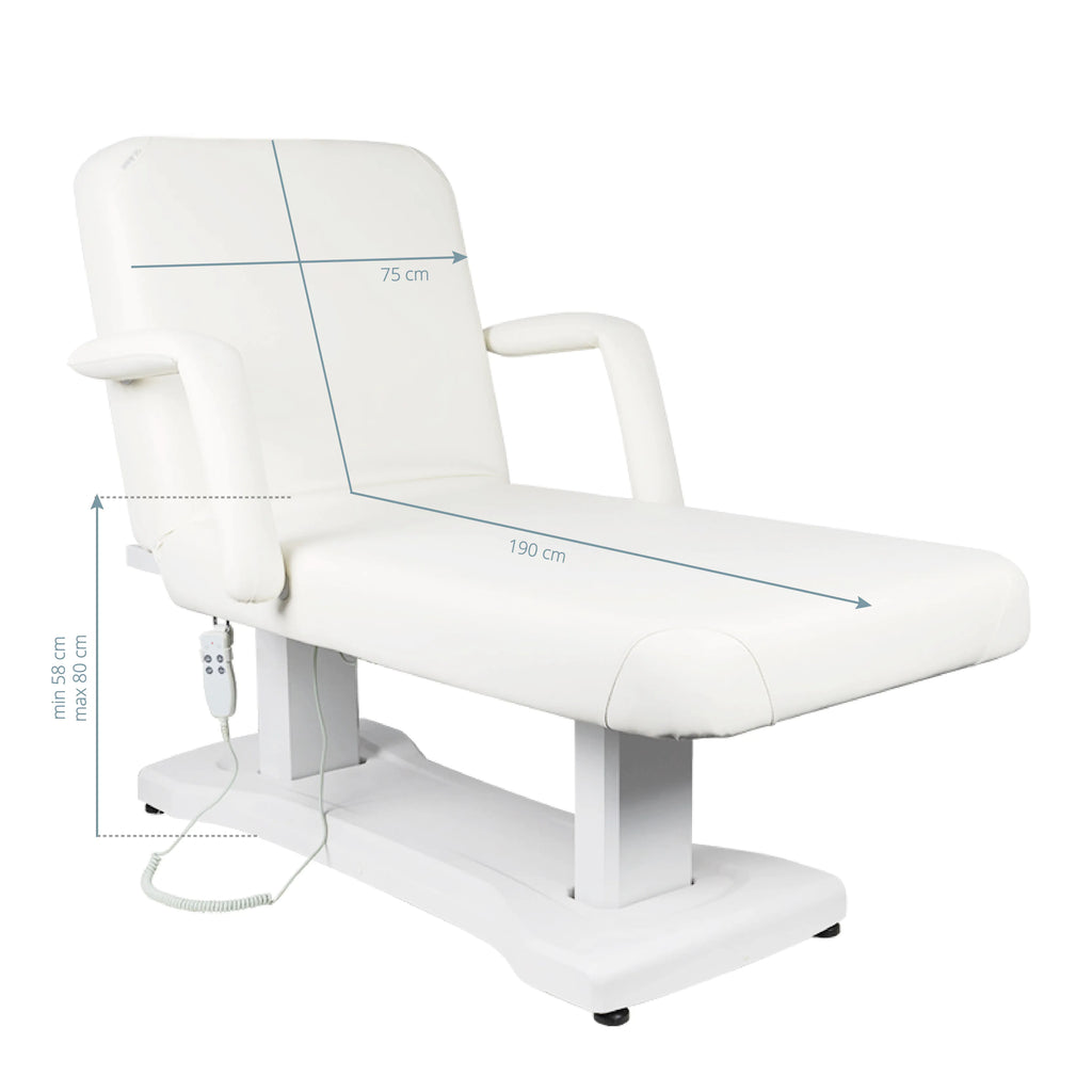 Eine elektrische Kosmetikliege verfügt über eine verstellbare Höhe in einem sehr breiten Bereich (58-80cm). Die Rückenlehne und die Höhe sind per Fernbedienung verstellbar. An der Rückenlehne ist eine Kopfstütze mit einem Gesichtsausschnit angebracht. Die Liege ist sehr breit (75 cm) und verfügt über eine dicke und sehr bequeme Matratze. Die Liege ist sehr stabil. Die Polsterung wurde aus einem hochwertigen Ökoleder hergestellt.