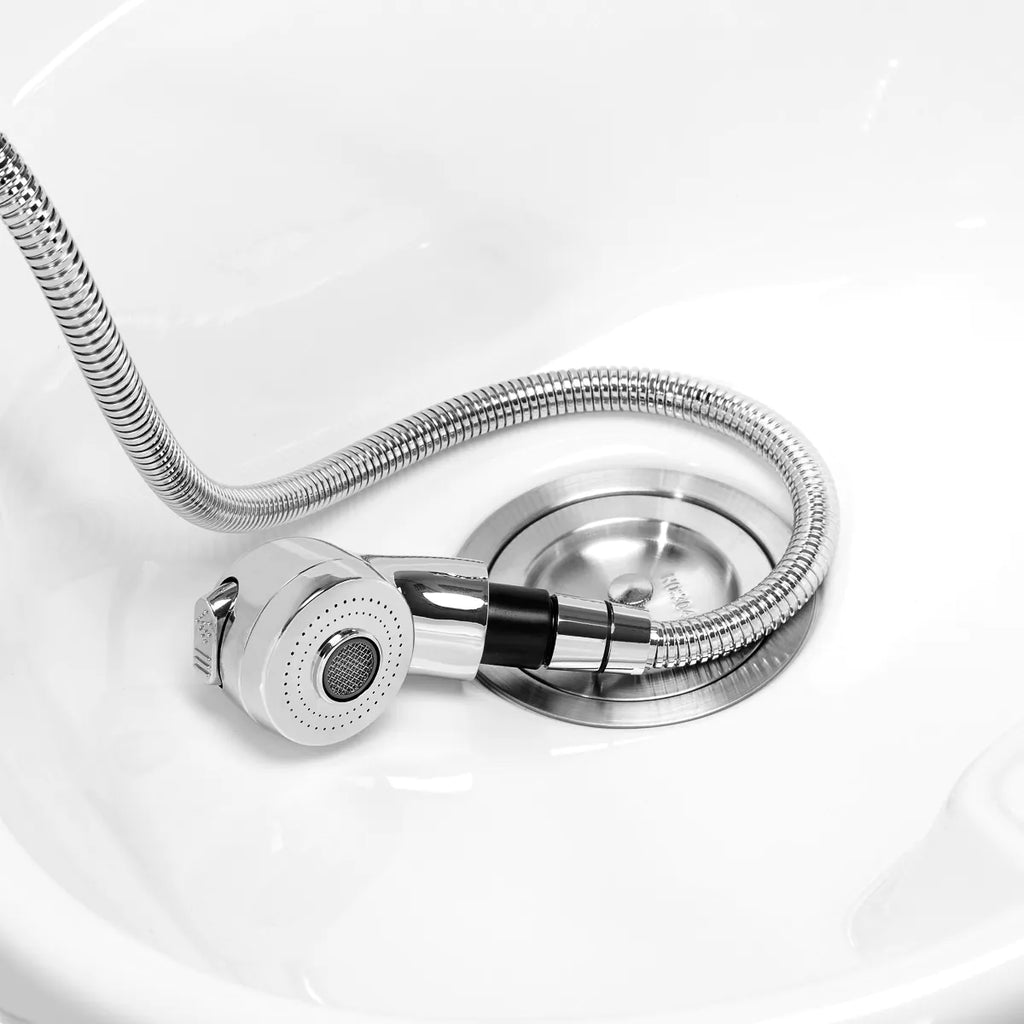 Die Waschanlage istmit einer Mischerbatterieausgestattet, die einen ständigen Zugang zu warmem und kaltem Wasser gewährleistet. So können Sie die Temperatur ganz einfach an die Vorlieben des Kunden anpassen.Ein Duschkopf mit einem 120 cm langen Schlauchund einer speziellen Ablagestelle erleichtern die Arbeit, undein verchromter Stopfen mit einem speziellen Siebermöglicht es Ihnen, den Wasserfluss zu kontrollieren und hohe Hygienestandards im Salon aufrechtzuerhalten.Der Wasseranschlusswurde im Inneren der Säule platziert, was ein effizientes Verbergen von Rohren ermöglicht, währenddie leicht zu entfernende Plattebei Bedarf einen einfachen Zugang bietet. Der Stuhl wurde so profiliert, dass er bei verschiedenen Behandlungen Komfort bietet, unddie Fußstütze bietet eine hervorragende Unterstützung für die Beine. Die Kombination aus Funktionalität und Ausstattung macht das Arbeiten in einem Friseursalon noch komfortabler.