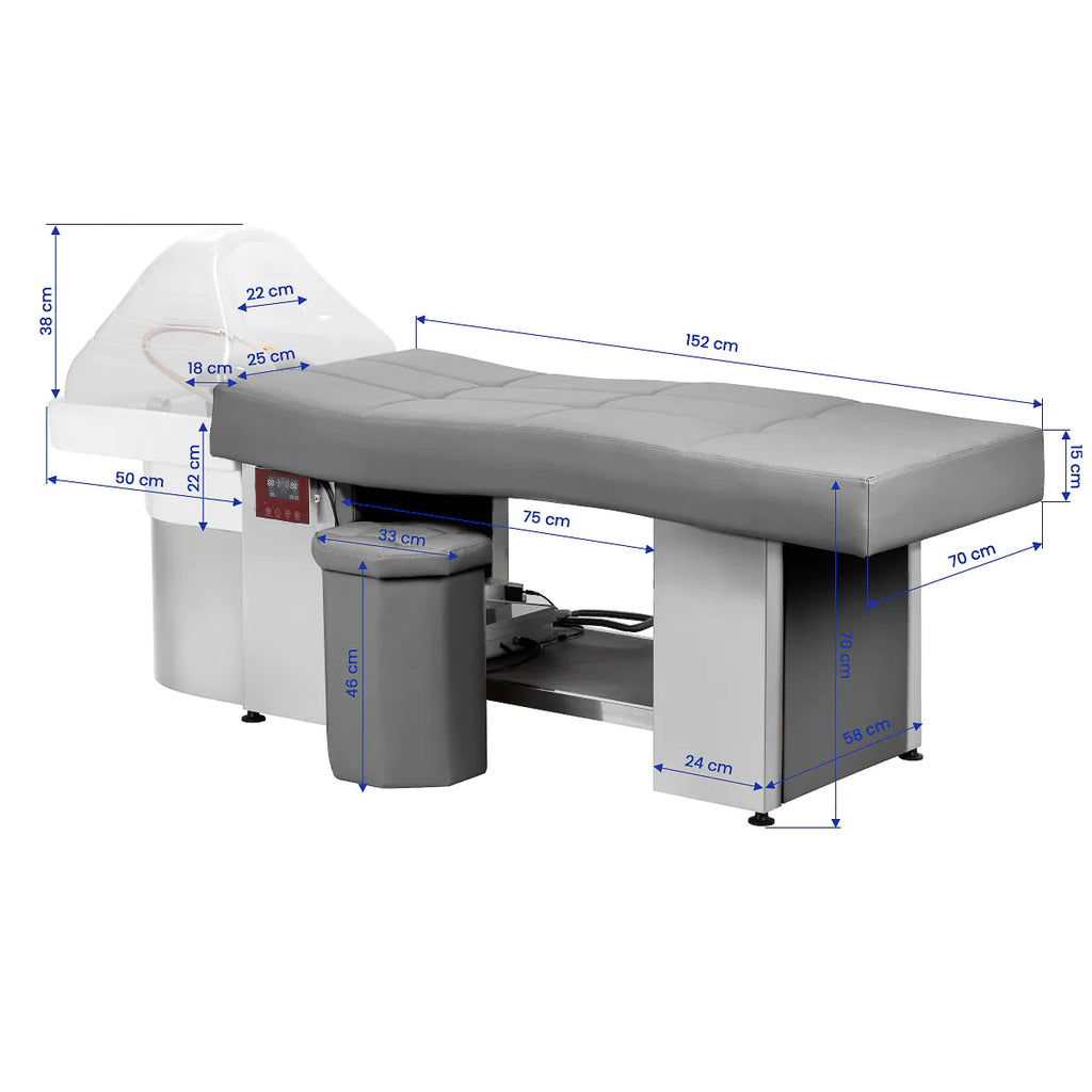 Die eleganteLiege Gabbiano Head Spa 017 mit integrierter Waschanlageist eine innovative SPA-Liege, geschaffenfür professionelle Pflege- und Entspannungsbehandlungen. Es ist ideal für die Behandlungen desluxuriösen Japanese Head SPA, das eine breite Palette von Therapien für Kopfhaut und Haar anbietet. Es ermöglicht Ihnen, Hydrotherapie, Wasserstrahlmassage, Aromatherapie und Lichttherapietechniken zu kombinieren undso ein ganzheitliches Pflegeerlebniszu bieten. Fortschrittliche Technologien und ergonomisches Design bieten nicht nurunvergleichlichen Komfortfür die Kunden, sondernerleichtern auch die Arbeit von Schönheits- und Wellnessprofis. Gabbiano Head Spa 017 ist eineeinzigartige Kombination aus Tradition und Moderne, die für tiefe Entspannung, Pflege und Hydratation von Kopfhaut und Haaren sorgt. Darüber hinaus kann eszur Massage des Körpers verwendet werdenund bietet umfassende therapeutische und entspannende Möglichkeiten.