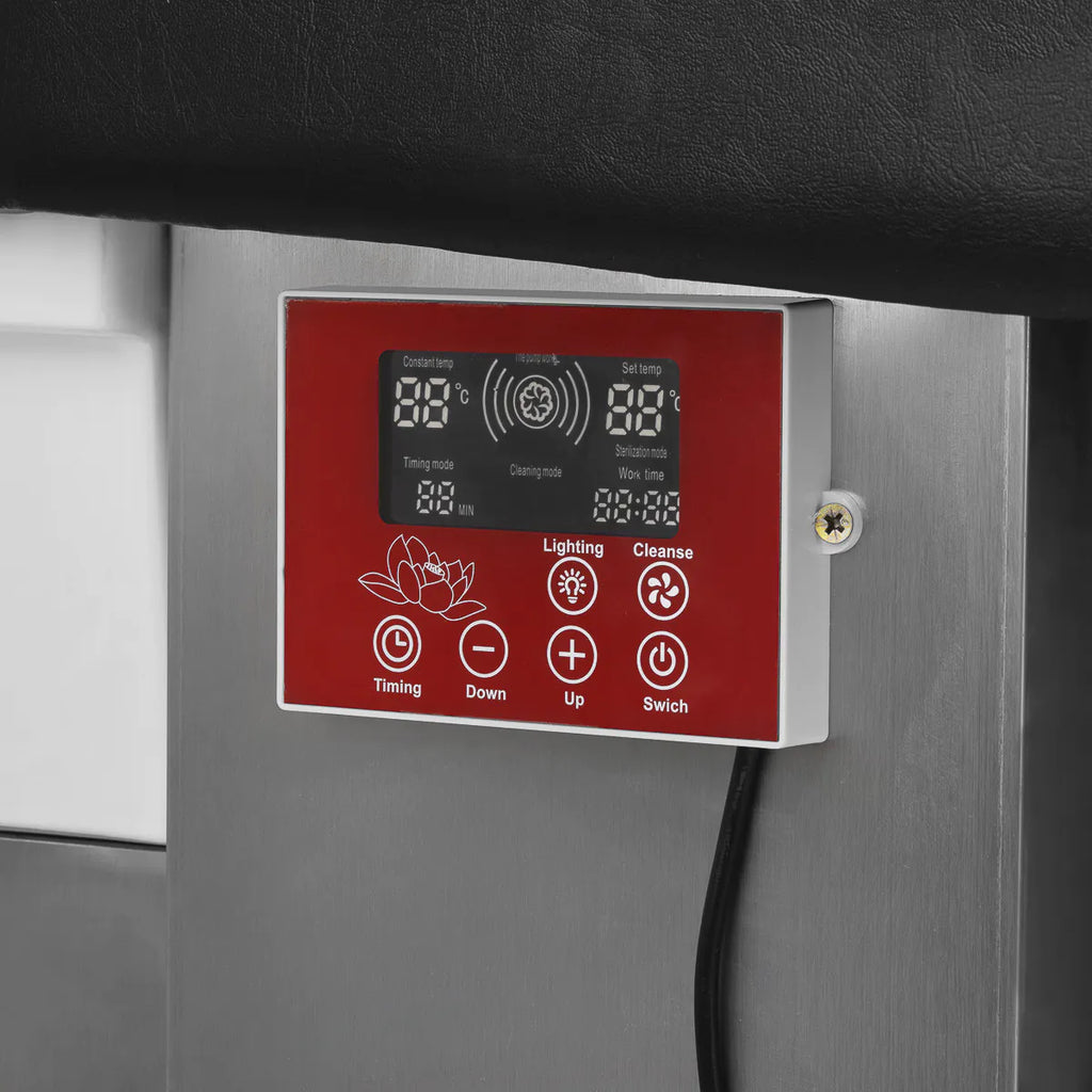 Das intuitive Touchpanelbietet die volle Kontrolle über die Funktionen der Waschanlage. Es ermöglicht Ihnen, die Betriebszeit und die Temperatur des Wassers einzustellen sowie deren aktuelle Werte zu überwachen. Dank deseingebauten Displayskönnen Sie jederzeit sehen, wie lange das Gerät schon läuft. Das Panel ermöglicht es Ihnen auch,die Hintergrundbeleuchtung der Schüssel einzuschaltenund so eine Atmosphäre der Entspannung und des Luxus zu schaffen. Darüber hinaus istdas Dampftherapiegerät mit einer Fernbedienungfür eine komfortable Fernbedienung ausgestattet.