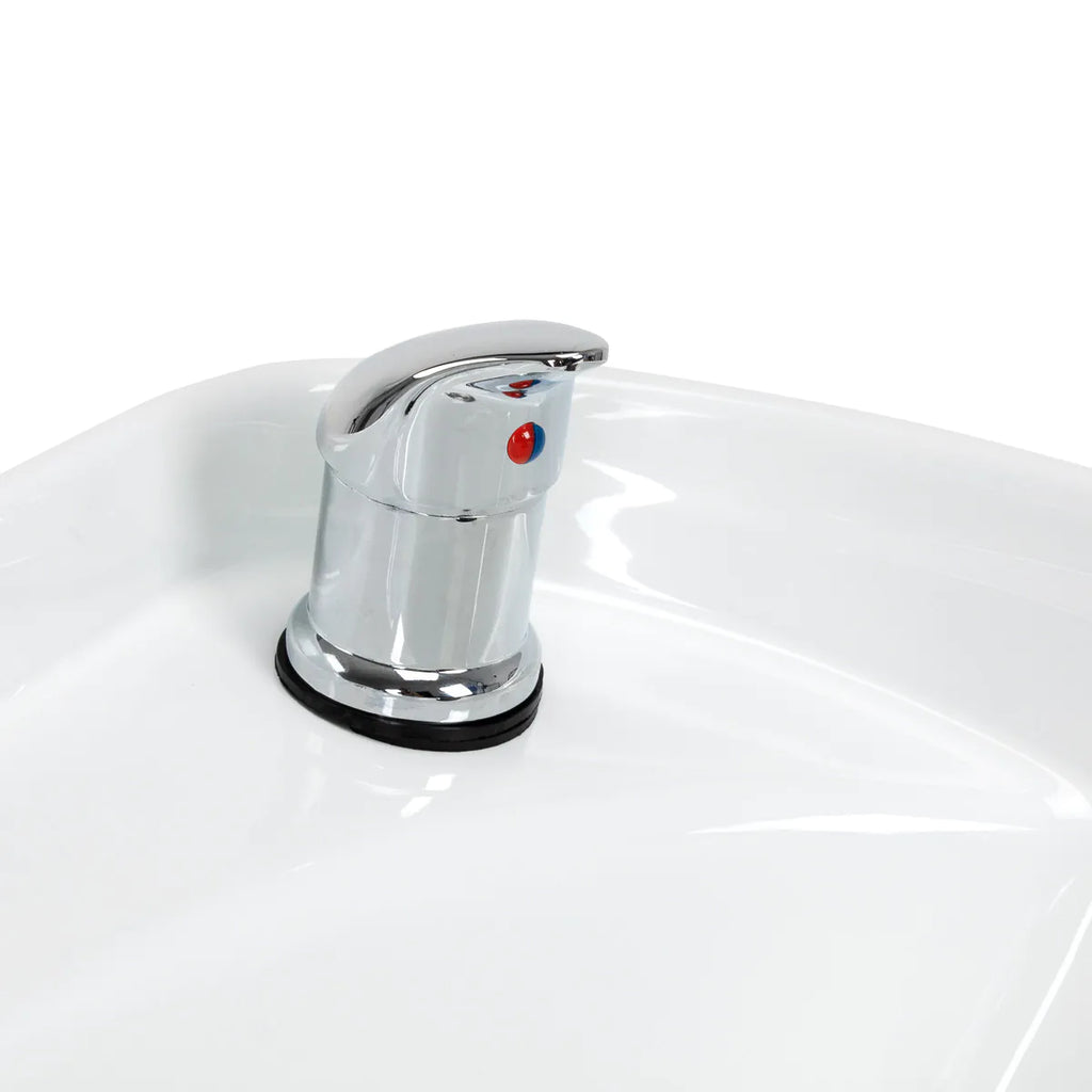 Die Tiefe des Keramik-Waschbeckens in Weißtönen ermöglicht eine komfortable und effektive Durchführung einer Vielzahl von Friseurdienstleistungen und verhindert übermäßiges Spritzen von Wasser und Produkten, die während der Behandlung verwendet werden. Das verwendete Material macht das Waschbecken langlebig, resistent gegen Verfärbungen und Kratzer und sehr leicht zu reinigen. Ein richtig profilierter Kragen und eine schräge Rückenlehne sorgen für Halt und Komfort beim Haarewaschen, und dank des bequemen Kunststoffaufzugs in Schwarztönen wird der Kunde nicht die Unannehmlichkeiten spüren, die mit der Kälte der Keramikoberfläche verbunden sind.