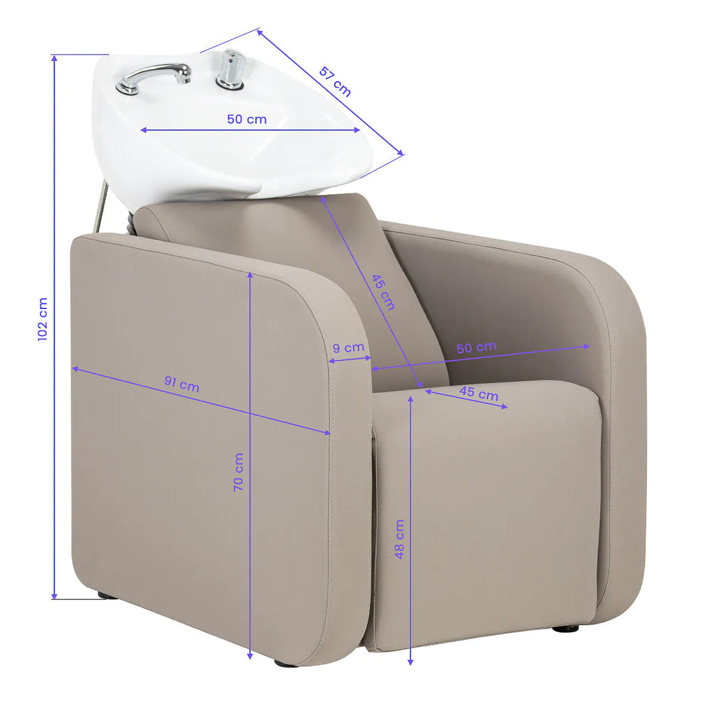 Die Friseurwaschstation Gabbiano Emma wurde entwickelt, um Pflege- oder Färbebehandlungen bequem durchzuführen und dem Kunden bei längeren Eingriffen eine bequeme Position zu bieten. Die Rückenlehne ist in einem optimalen Winkel platziert, um die Wirbelsäule hervorragend zu stützen. Ein gut profilierter Sitz, der mit strapazierfähigem Schaumstoff gefüllt ist, sorgt für hohen Bedienkomfort, und gepolsterte Armlehnen ermöglichen die korrekte Positionierung der Schultern des Kunden. Der Kunstlederbezug in Beigetönen garantiert eine langjährige Haltbarkeit und einfache Reinigung. Die schlanke Form der Waschanlage fügt sich perfekt in das elegante Interieur von Friseursalons ein. Eine komplette Armatur in Chromtönen ist im Lieferumfang enthalten, einschließlich eines Wasserhahns, eines Duschkopfs und spezieller Schläuche, um ein komplettes Set an Werkzeugen für die Arbeit bereitzustellen.