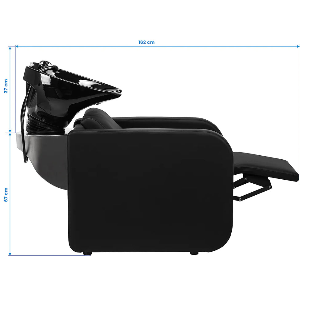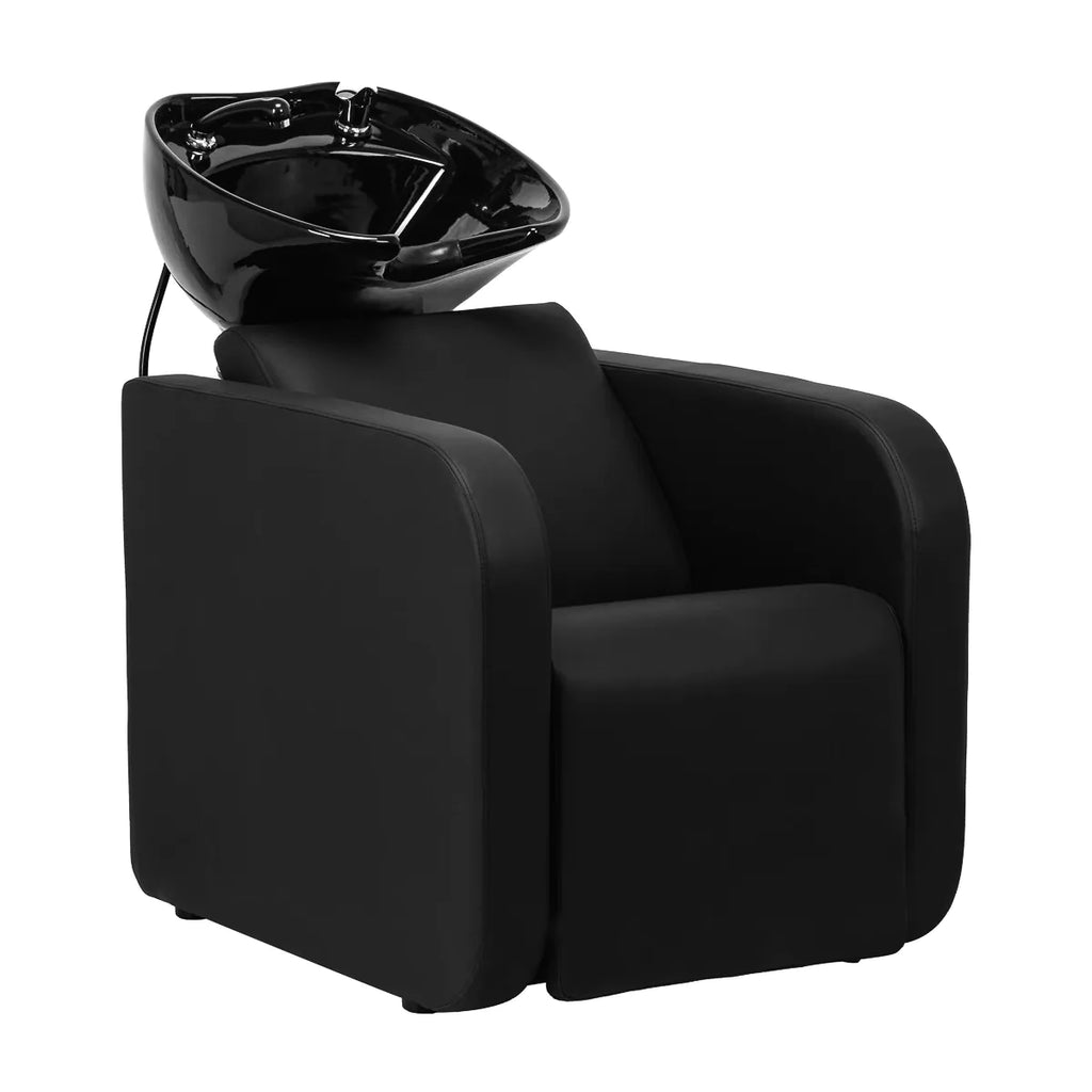 Die Tiefe des Keramik-Waschbeckens in Schwarztönen ermöglicht eine komfortable und effektive Durchführung einer Vielzahl von Friseurdienstleistungen und verhindert übermäßiges Spritzen von Wasser und Produkten, die während der Behandlung verwendet werden. Das verwendete Material macht das Waschbecken langlebig, resistent gegen Verfärbungen und Kratzer und sehr leicht zu reinigen. Ein richtig profilierter Kragen und eine schräge Rückenlehne sorgen für Halt und Komfort beim Haarewaschen, und dank des bequemen Kunststoffaufzugs in Schwarztönen wird der Kunde nicht die Unannehmlichkeiten spüren, die mit der Kälte der Keramikoberfläche verbunden sind.