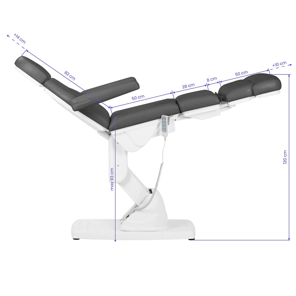 Der elektrische Podologiestuhl von Kateverbindet Funktionalität mit einem modernen, minimalistischen Design. Ausgestattetmit 4 Aktuatoren, die über eine Fernbedienung an einem Kabel gesteuert werden, bietet es eine Vielzahl von Einstellmöglichkeiten, einschließlich einer bequemen Fußstützenpassform. Der ergonomisch profilierte Sitz und die Möglichkeit, den Stuhl in viele Positionen zu verstellen, ermöglichen einevollständige Anpassung an die Bedürfnisse des Kunden und des Fachmanns. Dadurch eignet sich der Stuhl sowohl für Podologiepraxen als auch für andere Einrichtungen,die komfortable und vielseitige Lösungenerfordern.