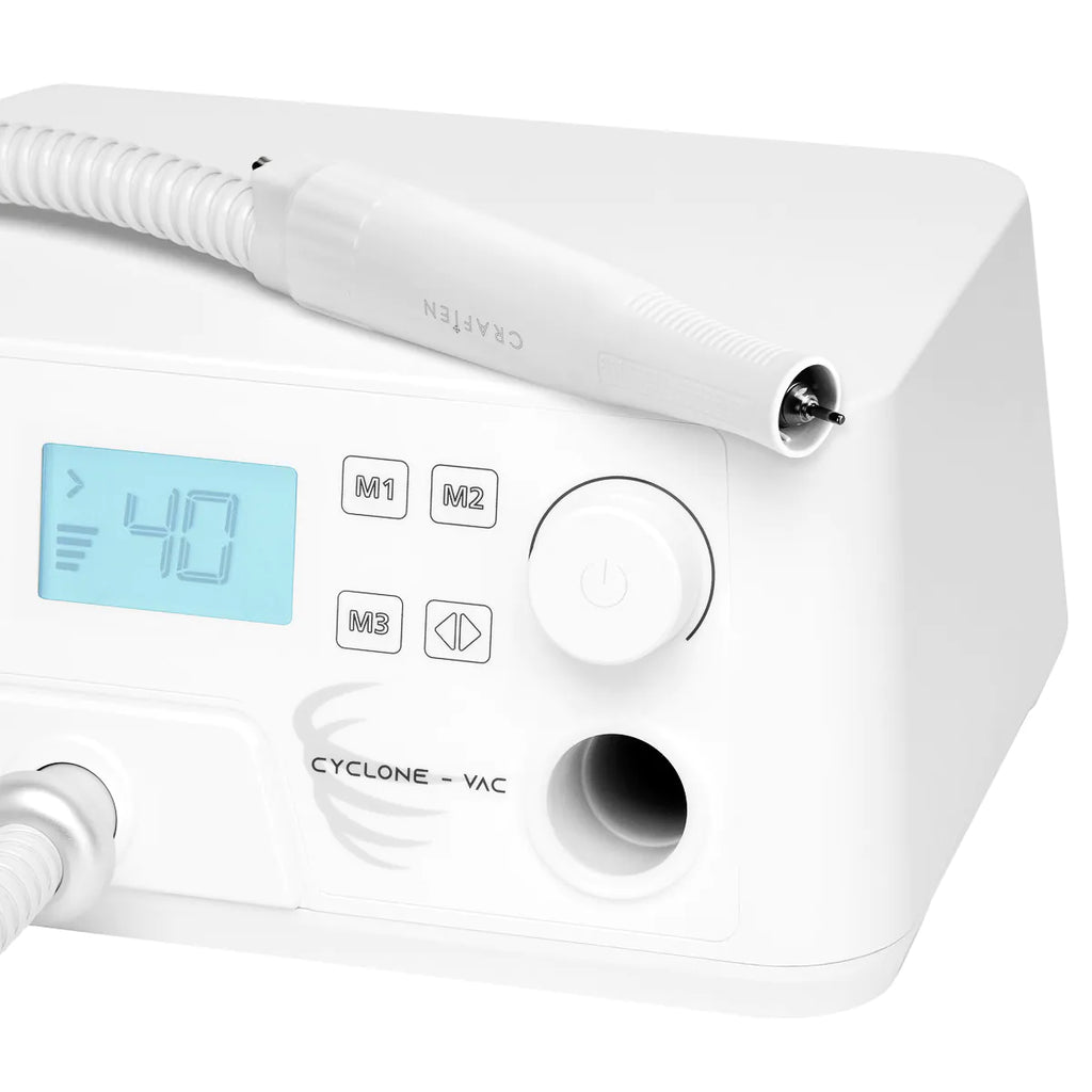 Ästhetisches, futuristisches Gehäusein Weißtönen passt perfekt in jedes Interieur.Ein spezieller Platz zum Abstellen des Kopfesermöglicht ein viel komfortableres Arbeiten, undrutschfeste Füßesorgen für die Stabilität des Geräts während des Gebrauchs. Die Saeyang Cyclone-Vac Fräsmaschine mit Absorber ist durcheine 12-monatige Garantieabgedeckt.