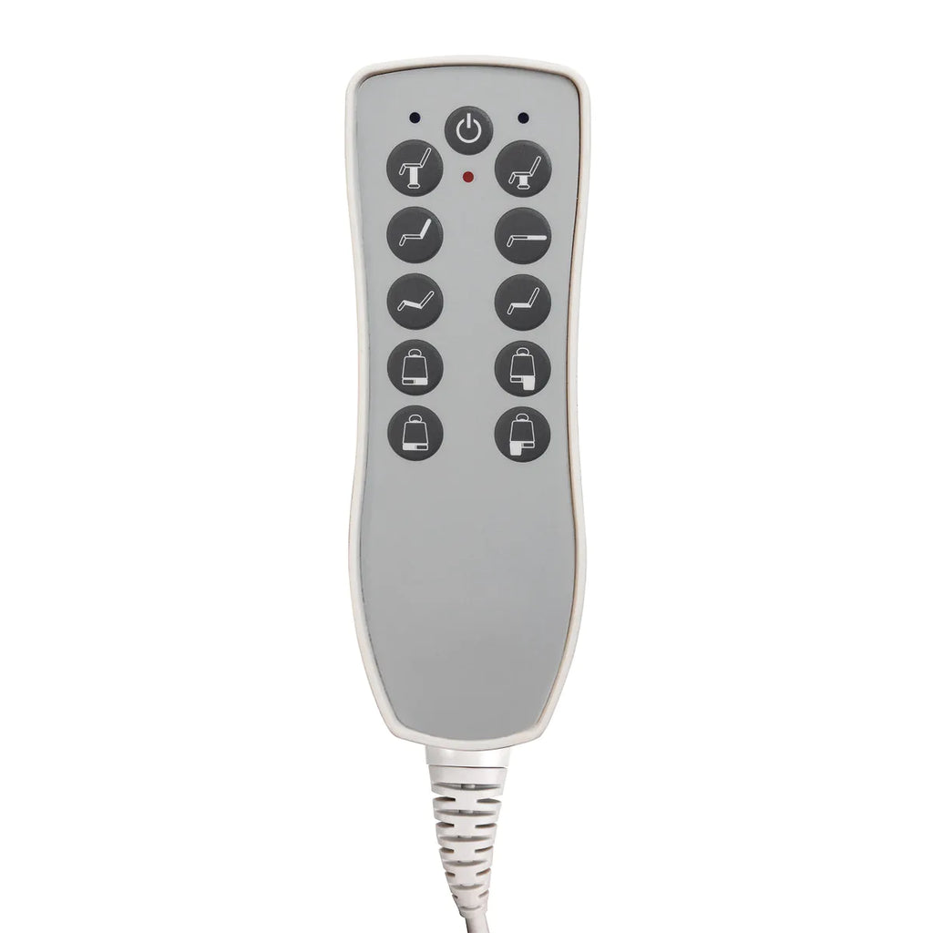 Die Steuerung mit einer kabelgebundenen Fernbedienung ermöglichteine präzise Positionierung des Stuhls in fünf Ebenen: Höhenverstellung, Positionierung der beiden Teile der Fußstütze und der Wiege. Ein solcher Einstellbereich ermöglicht es,die Position an die Art der durchgeführten Behandlung anzupassen– sowohl im Hinblick auf den Komfort des Kunden als auch auf die Ergonomie der Arbeit des Spezialisten. Zur Vereinfachung der Bedienungkann die Fernbedienung an die Griffe gehängt werden, die sich auf beiden Seiten des Sitzes befinden.