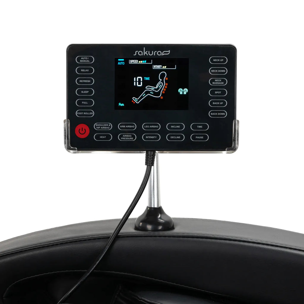 Das übersichtliche Bedienfeldmacht die Nutzung des Stuhls einfach und angenehm. Für mehr Komfort sorgt die Möglichkeit, es auf einen Griff zu legen, der an der rechten Armlehne montiert ist, oder es in den Händen zu halten. Aufdem transparenten LCD-Bildschirmkönnen Sie die Bedienung des Geräts verfolgen, es werden klar angezeigt, es gibt Bereiche des Körpers, an denen die Massage gerade durchgeführt wird, ihre Intensität, Behandlungszeit und ausgewähltes Programm. Auf dem Bedienfeld können Sie das Massageprogramm auswählen,die Einstellungen des Stuhls und der Massagefunktion frei anpassen, die Intensität einstellen sowie die Dauer der Behandlung einstellen, die 15, 20, 25 oder 30 Minuten betragen kann.