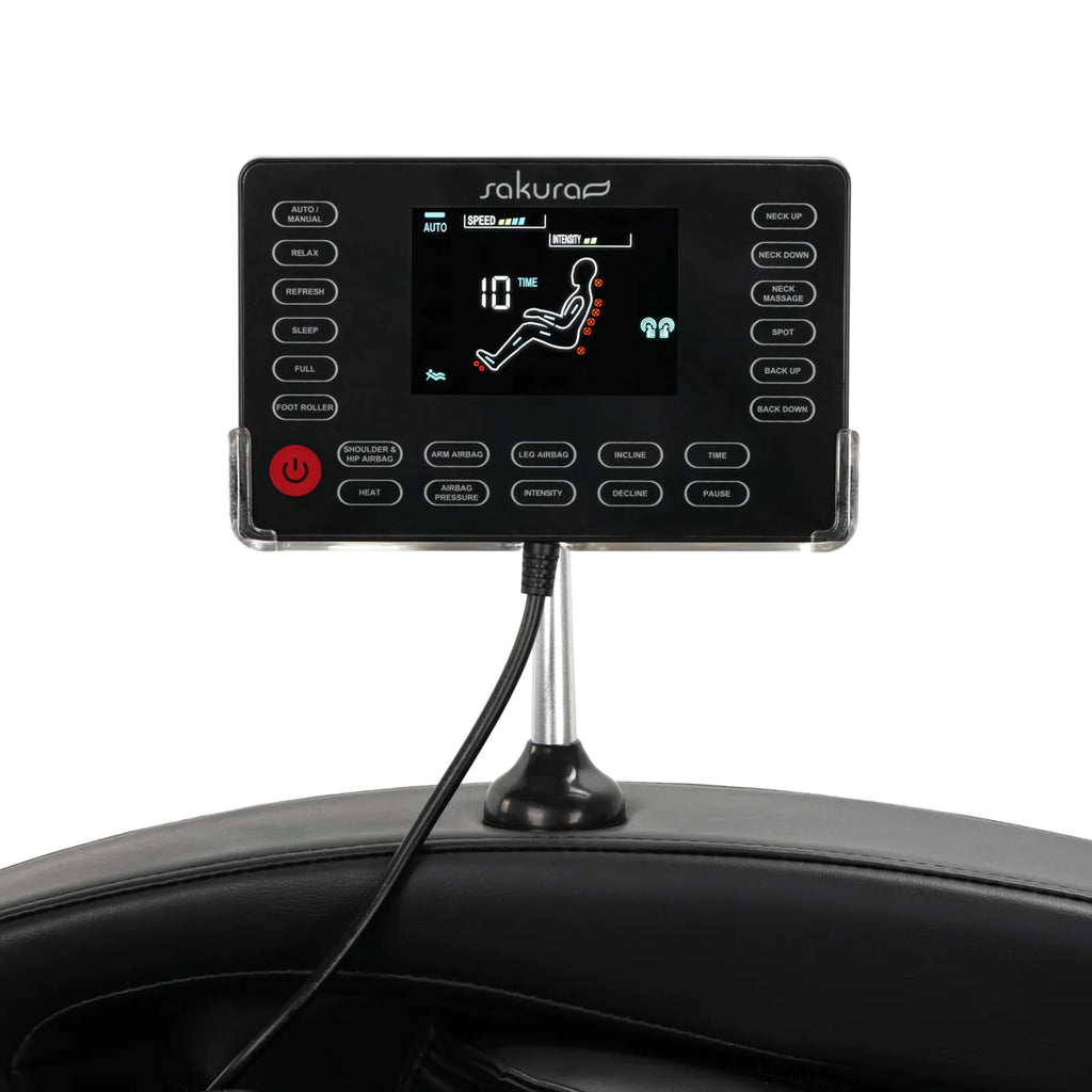 Das übersichtliche Bedienfeldmacht die Nutzung des Stuhls einfach und angenehm. Für mehr Komfort sorgt die Möglichkeit, es auf einen Griff zu legen, der an der rechten Armlehne montiert ist, oder es in den Händen zu halten. Aufdem transparenten LCD-Bildschirmkönnen Sie die Bedienung des Geräts verfolgen, es werden klar angezeigt, es gibt Bereiche des Körpers, an denen die Massage gerade durchgeführt wird, ihre Intensität, Behandlungszeit und ausgewähltes Programm. Auf dem Bedienfeld können Sie das Massageprogramm auswählen,die Einstellungen des Stuhls und der Massagefunktion frei anpassen, die Intensität einstellen sowie die Dauer der Behandlung einstellen, die 15, 20, 25 oder 30 Minuten betragen kann.