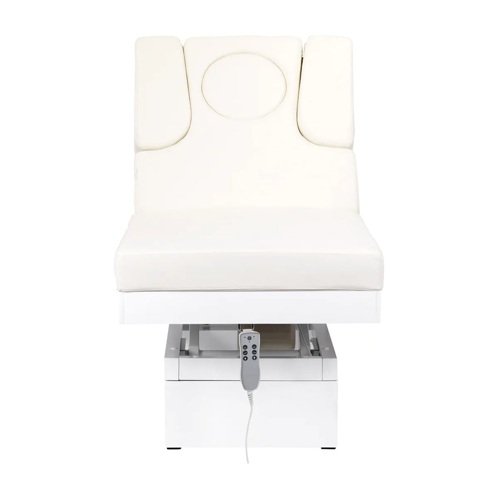 Eine neue Kosmetikliege. Die Spa-Kosmetikliege Azzurro A314S ist zweifellos ein Bestseller unter Kosmetikliegen. Die Kosmetikliege verfügt über eine elektrisch verstellbare Höhe in einem sehr breiten Bereich (62-90 cm). Die Rückenlehne ist ebenfalls mit Fernsteuerung zu verstellen, von horizontaler Position fast bis zur vertikalen Position (bis 80 Grad). In der Rückenlehne befinden sich zwei Ausschnitte mit wechselbaren Abdeckelementen (Element zur völligen Abdeckung + Element für Gesichtsausschnitt). Es besteht die Möglichkeit, die Seitenteile der Rückenlehne zur Seite herauszuziehen oder völlig zu demontieren. Unter der Rückenlehne befindet sich die Schublade für Hand-Zubehör. Die Liege ist sehr breit (76 cm) und verfügt über eine dicke und sehr bequeme Matratze. Die Liege ist sehr stabil. Die Kosmetikliege ist mit einem hochwertigen Ökoleder mit sanftem Ecru-Farbton gepolstert. Das Möbelstück ist in schönem Wenge erhältlich.