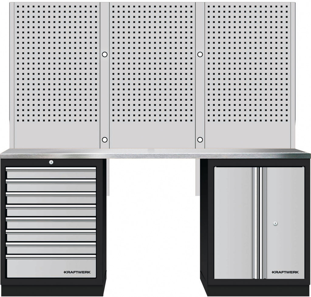 The KRAFTWERK MOBILIO 2-unit base cabinet combination offers a compact and flexible solution for professional workshops. With eight drawers, a spacious cabinet, a sturdy 430 stainless steel worktop, and practical square-perforated panels, this system is ideal for bringing order and efficiency to your workspace.