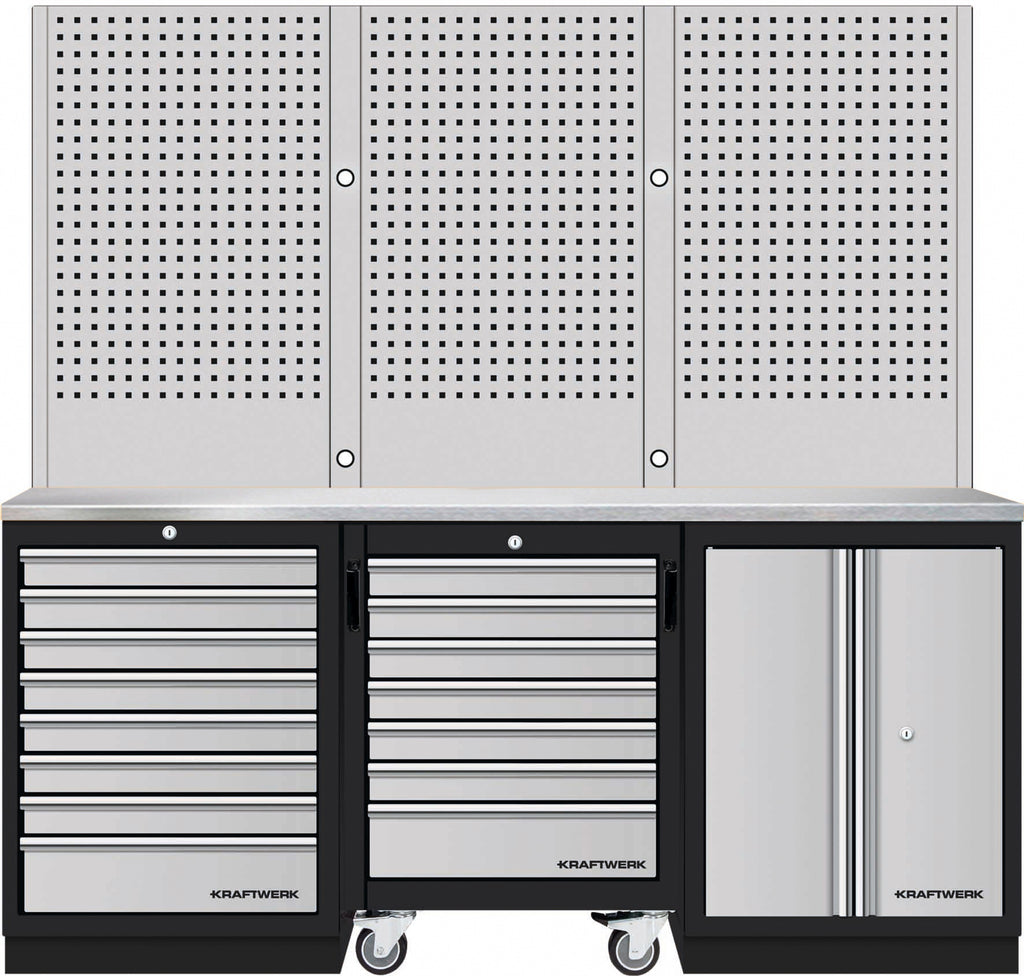 The KRAFTWERK MOBILIO 3-unit combination unit unites functionality and flexibility in a well-designed workshop solution. With a total of 15 robust drawers, divided between a base cabinet with 8 drawers and a rolling base cabinet, combined with a durable stainless steel worktop, this MOBILIO offers ample space for tools and materials. The rolling base cabinet with 7 drawers is easy to move and features ball-bearing full-extension runners for easy access.