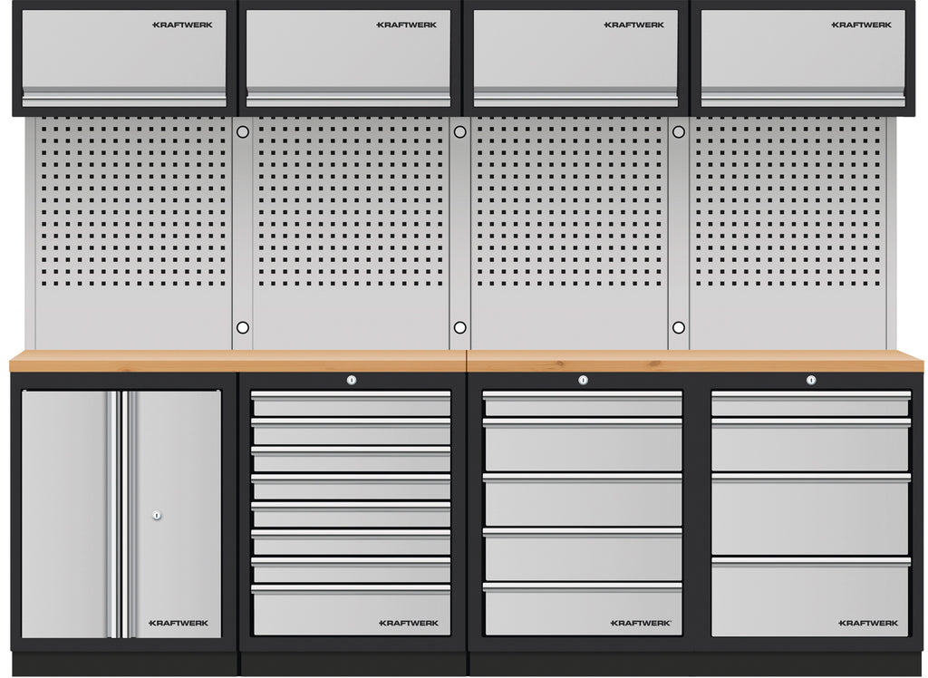 With the KRAFTWERK MOBILIO 4-piece combination unit, you get a flexible, expandable, and professional solution for your workshop. With generous storage space, a robust work surface, and well-thought-out details like the tool pegboards and the overhead cabinets with gas springs, you have everything you need to work efficiently and in an organized manner.