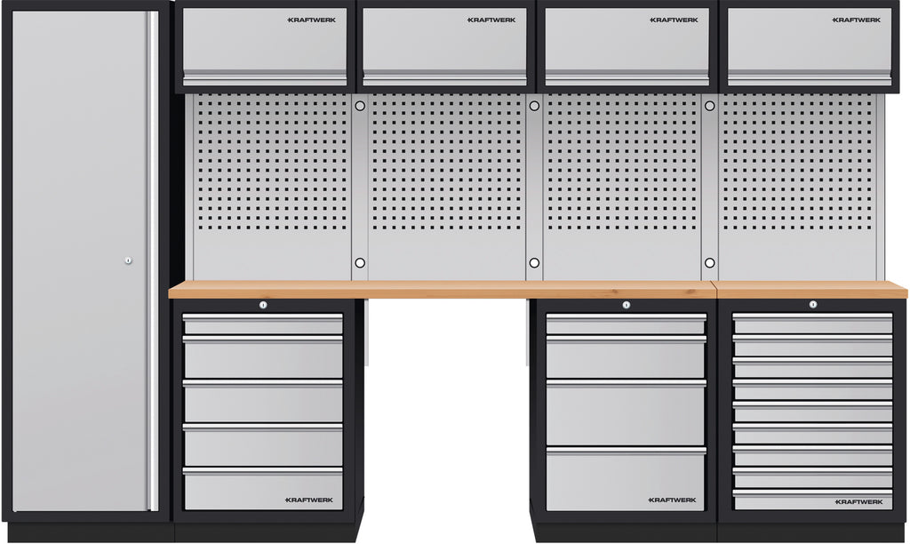With the KRAFTWERK MOBILIO 5-piece combination unit, you can create the perfect workshop solution, guaranteeing maximum flexibility, storage space, and organization. Whether you're a professional or a hobbyist, this system leaves nothing to be desired. Thanks to the 18 drawers, 5 cabinets, and the robust square-perforated panel, your equipment is always within easy reach and perfectly organized.