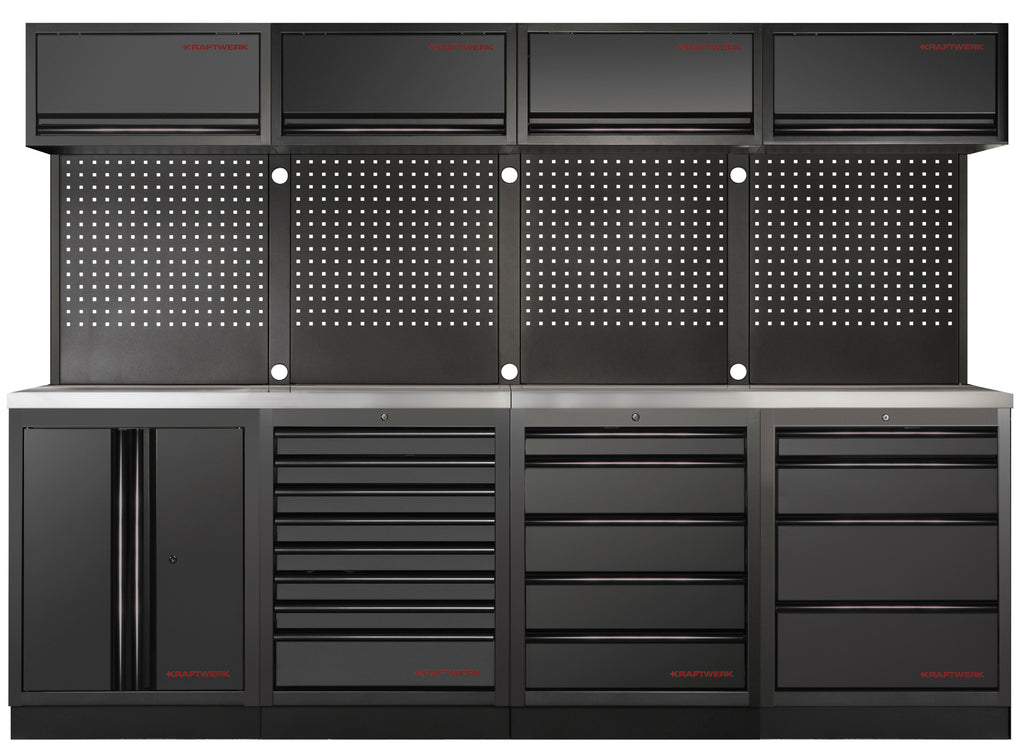 With the KRAFTWERK MOBILIO BLACK 4-piece combination unit, you get a flexible, expandable, and professional solution for your workshop. With ample storage space, a robust work surface, and well-thought-out details like the tool pegboards and the overhead cabinets with gas springs, you have everything you need to work efficiently and in an organized manner.