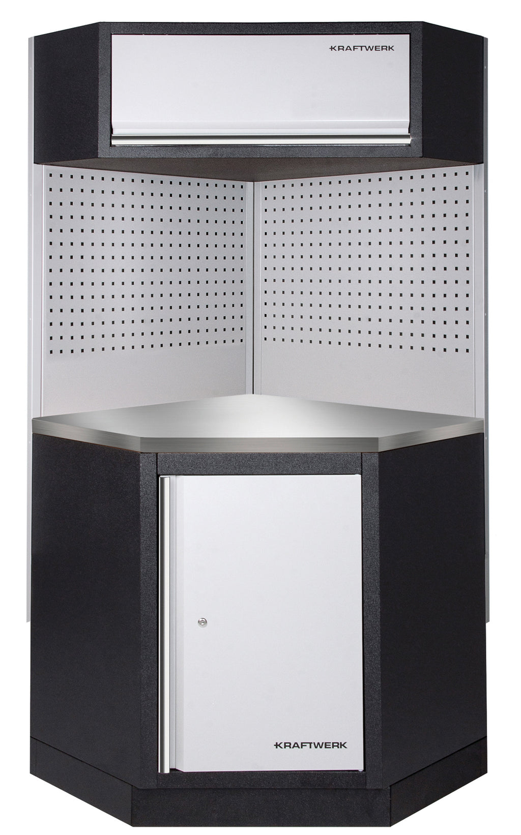 The KRAFTWERK MOBILIO corner unit offers the perfect solution for maximizing storage space, even in the corners of your workshop. Featuring a robust stainless steel worktop, a base cabinet, a wall cabinet, and a square perforated panel, this system combines practical storage with flexible design options. Ideal for anyone who wants to utilize every centimeter efficiently.