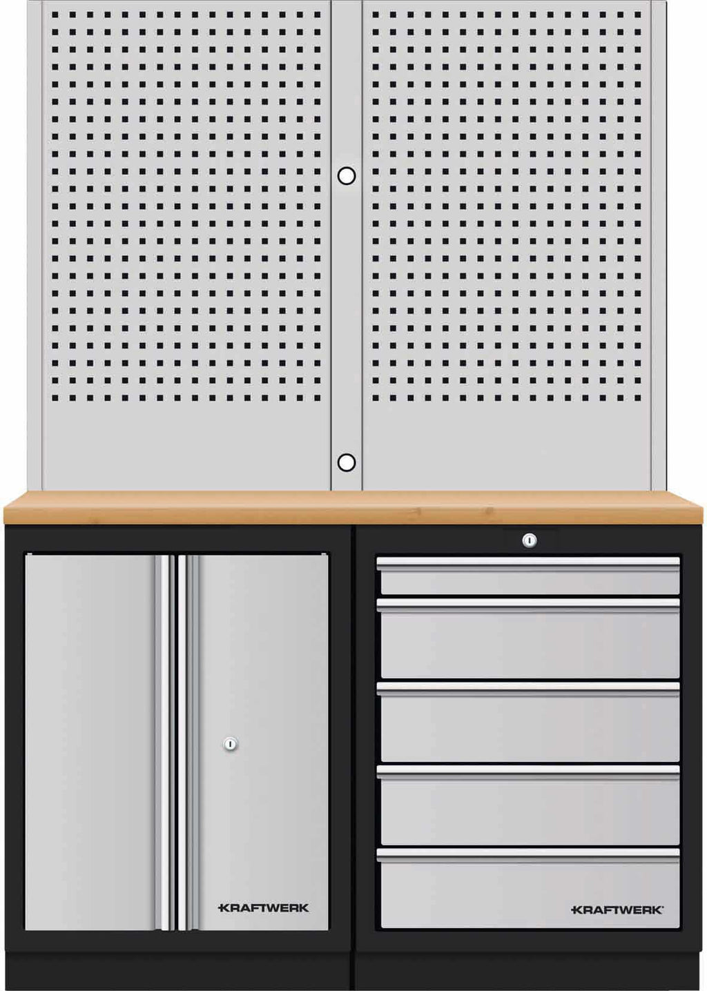 The KRAFTWERK MOBILIO 2-unit base cabinet combination consists of a double-door base cabinet and a drawer unit with five ball-bearing drawers of varying heights. The single-door base cabinet is ideal for larger tools or materials that don't fit in drawers. The smooth-running drawers allow you to perfectly organize smaller tools and quickly access everything you need for your work. The drawers are equipped with a central locking system to keep your tools securely stored.