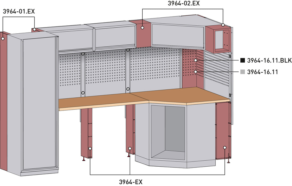 The 3964-16-EX extension set was specifically designed to increase the depth of the KRAFTWERK MOBILIO 3964-16 corner base cabinet. This modification creates a significantly larger work surface, providing additional space for tools, materials, and work processes.