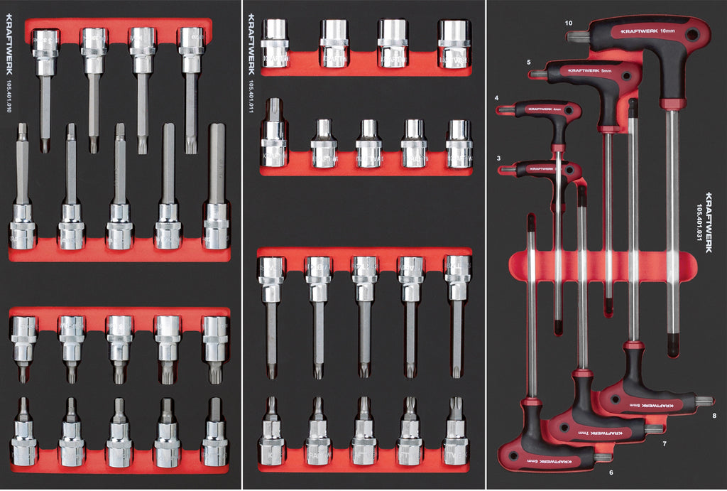 3/8" socket wrench inserts (6 pt.): 8 - 24 mm, long version 10 - 17 mm, external TX E10 - E20