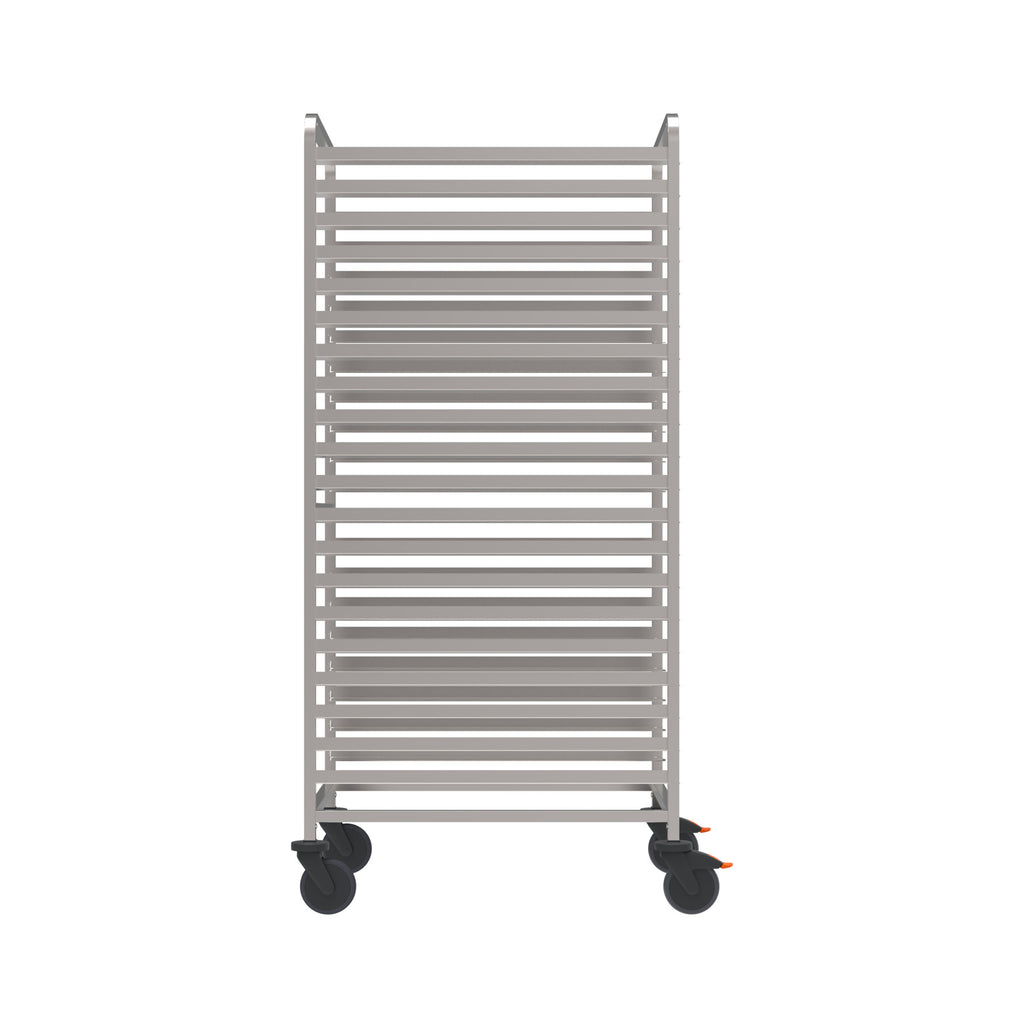 Through space-efficient assembly with trays and racks in baker's standard format.