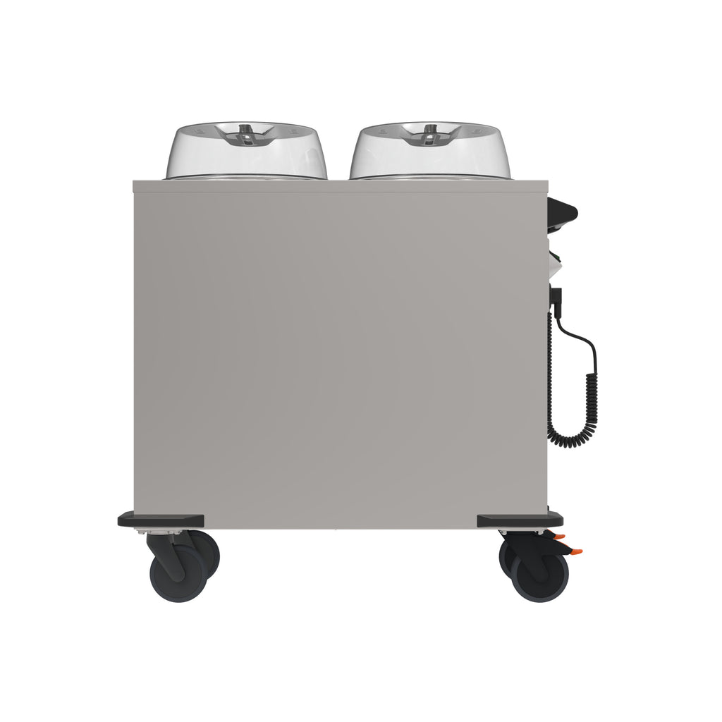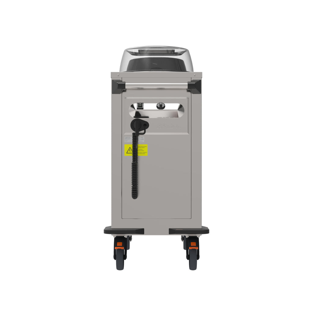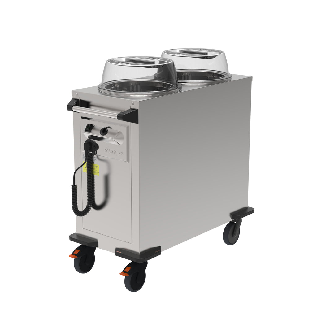 The tube stacker features powerful, adjustable circulating air heaters for warming, temporarily storing, and transporting round dishes in two adjustable tubes (diameters from 190-320 mm). Easily adjustable by hand using three adjustment rods each for the desired plate size, as well as the spring force based on the dish weight. It also features integrated overheating protection for perfect safety and includes polycarbonate lids for hygienic protection of the dishes*.
