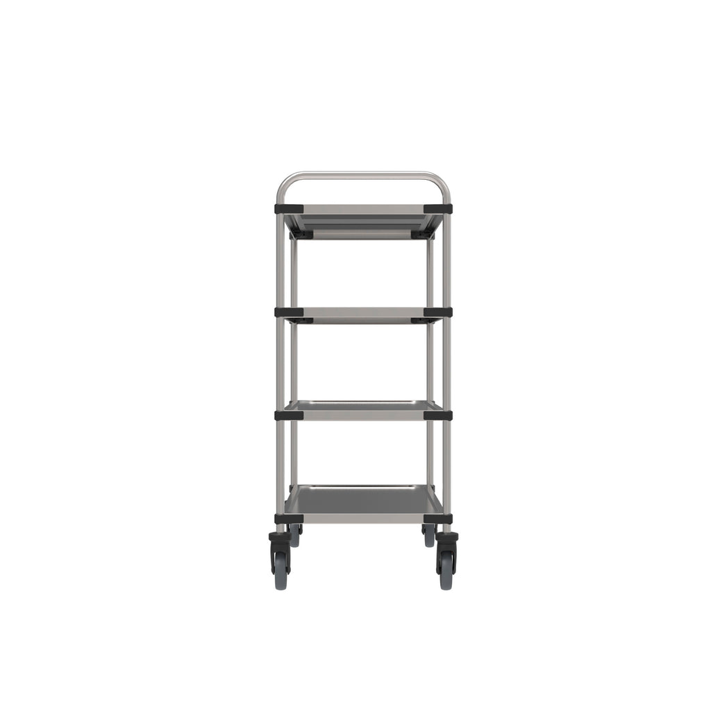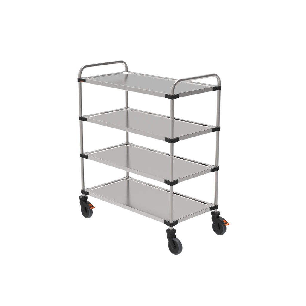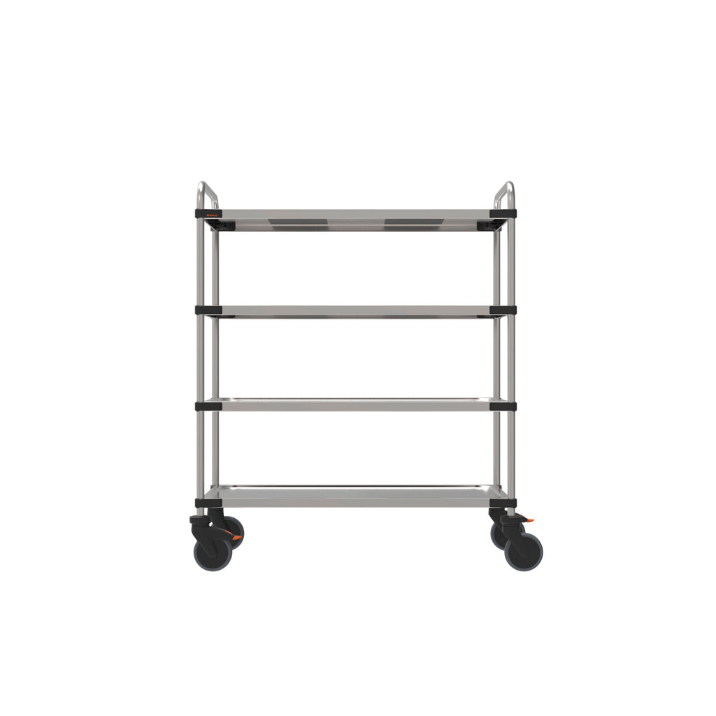 Available with 2 to 4 shelves and various shelf sizes, depending on the required transport volume. Available with stainless steel or galvanized casters. Air-identical casters are also available upon request for even better noise reduction. As an additional accessory, a matching stainless steel clearing container can be easily attached to the push handle. When assembled, the shelves can also be fitted with an additional rail made of round stainless steel for non-slip transport.