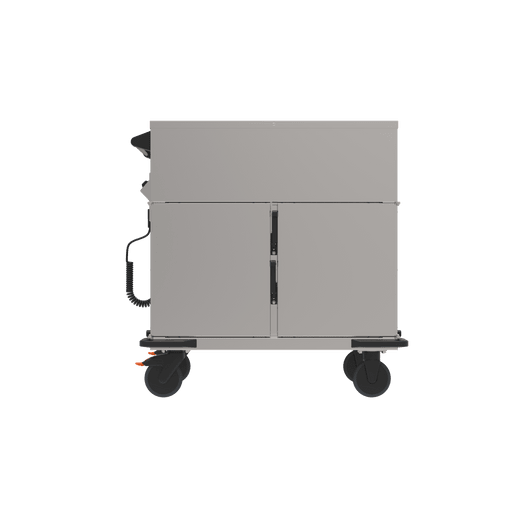 The robust food transport trolley features two GN 1/1 heated wells at the top and two cupboard compartments at the bottom, all separately controlled and electrically heated. It is used for the safe transport, hot and cold storage, and distribution of food in the GN system. For the highest food quality in food distribution. It can be reliably heated with both wet and dry heating, with dry heating providing significant energy savings and reducing the cleaning effort for the wells.