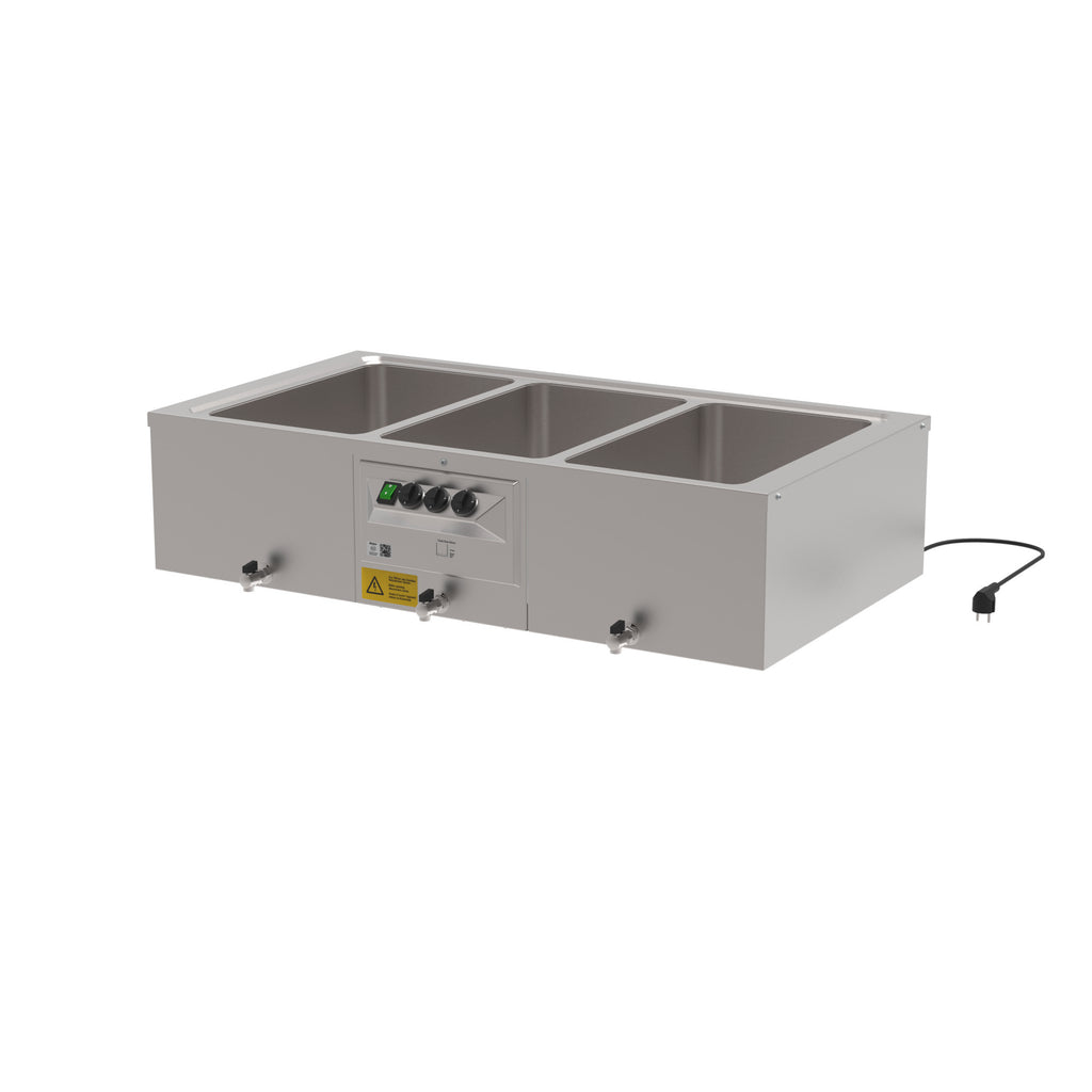 The three warming trays welded into the cover are insulated and electrically heated (wet-heated). They are lined with stainless steel and each equipped with a ball valve with a forward outlet toward the operator's side. The control panel features an on/off switch and three thermostats for temperature control (from +30 to +110 °C).