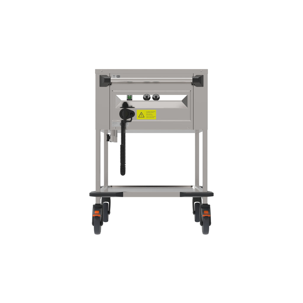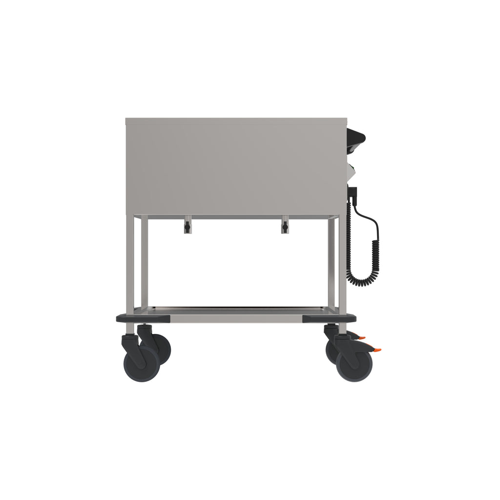 The robust stainless steel trolley with two separately adjustable, electrically heated GN 1/1 warming wells is used for safe transport, distribution on the conveyor belt, and dispensing of food in the GN system. This universal feeder trolley ensures the highest food quality at distribution stations. It can be reliably heated with both wet and dry heating, with dry heating providing significant energy savings and reducing the cleaning effort for the wells.