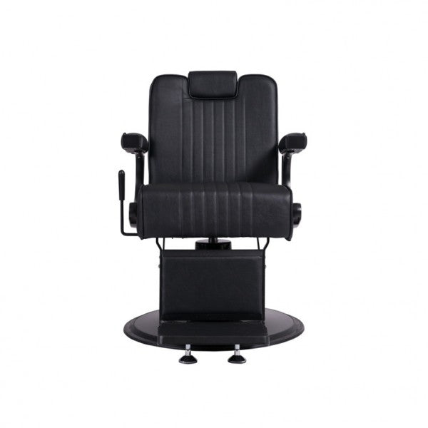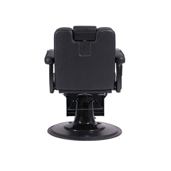 This robust barber chair features a chassis made of die-cast aluminum parts and a sturdy internal metal structure, ensuring exceptional stability and durability. The round base and footrest with a matte black finish give the chair a stylish look and provide added stability. Equipped with a high-quality hydraulic pump, the chair allows for easy height adjustment. The seat is padded with high-density foam and springs, guaranteeing maximum comfort and longevity. The integrated headrest and upholstery with black stitching add an elegant touch.