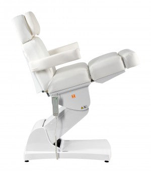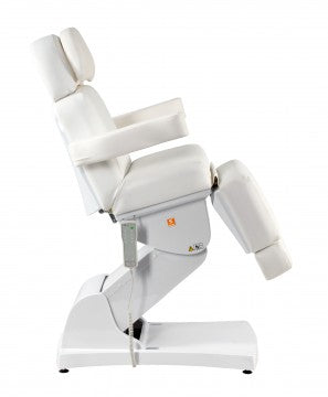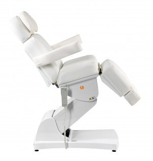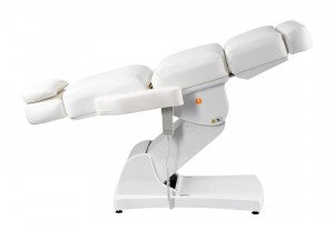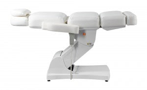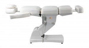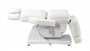 The height and tilt, as well as the backrest and leg rest, of the treatment table are adjustable via four powerful motors and remote control. The footrest, which folds down almost 90°, allows your clients comfortable access from the front. The headrest and footrest can be extended or completely removed. The armrests fold down and move with the tilt of the backrest. A face cutout is located in the headrest beneath the removable neck pillow. The Comfort series products feature very quiet, smooth-running, and powerful motors.