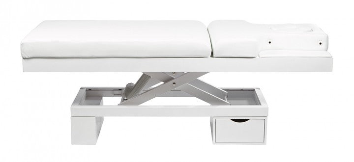 The high level of user comfort is further enhanced by continuously adjustable armrests next to the headboard with its closable face cutout. The base, made of high-quality, white-coated wood, contains a large drawer offering ample storage space.