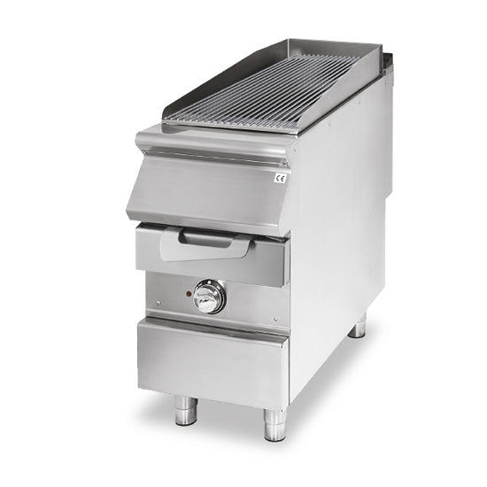 Side walls, base, and back made of stainless steel. Work surface made of AISI 304 20/10 stainless steel. Enameled cast iron chimney. Grill grate with stainless steel bars. Grease collection tray. 3-sided splash guard made of AISI 304 stainless steel and removable grease tray, which is recommended to be filled with water for easy cleaning. The evaporation of the water tenderizes the grilled food. Armored heating elements made of Incoloy are installed under the cooking grate. Specially designed knobs prevent water from entering the control panel. Equipped with a low chimney.