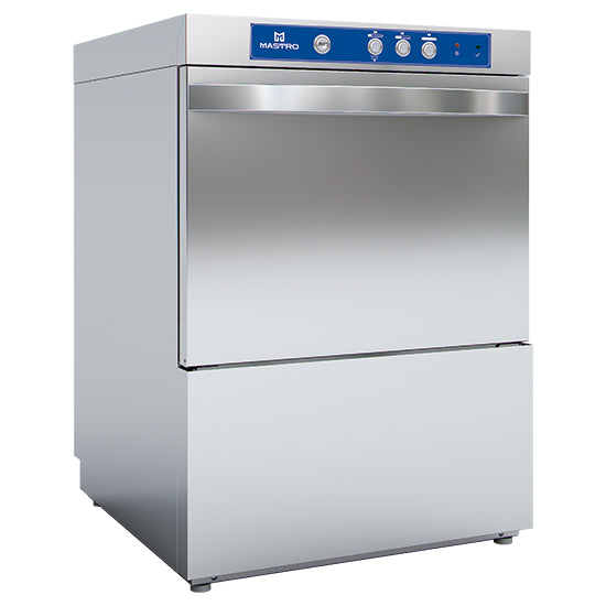 Stainless steel construction. Fully double-walled housing. Double-spring-loaded door with stainless steel struts. Rounded wash chamber for easy cleaning and emptying. Protected stainless steel heating elements in the wash chamber and wash tank. Internal usable height of 360 mm. Space for GN 1/1 trays. 7-liter tank capacity. Safety magnetic switch for door opening. Safety thermostat. Model with mechanical control panel. 20-liter tank with a 2.8-liter heating element. Single-phase multi-power installation. Rinse rinse with the Thermostop system. Factory-set settings. Easy to activate. Various voltage options: can be connected to a single-phase or three-phase power supply. Double filter tray system in the wash chamber. Included: rinse pump, wastewater pump (tank emptying program), peristaltic detergent dispenser. 1x base basket, 1x plate basket, and 2 cutlery baskets. Standard delivery: 230V/ 1F+N.