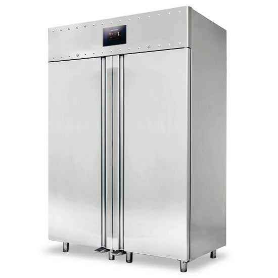 Interior and exterior made of AISI 304 stainless steel. Rounded interior corners. Polyurethane insulation. Insulation thickness: 85 mm. Self-closing door with magnetic seals. Door microswitch. Electronic control with WiFi connection. Automatic defrosting. Automatic evaporation. Fan-assisted cooling. Tropicalized and extendable monoblock condensing unit (ambient temperature +43°C, maximum humidity 65%). Height-adjustable stainless steel feet. Standard equipment: 3 x GN 2/1 Rilsan shelves for each door, LED lighting, door lock, drain plug, foot pedal.