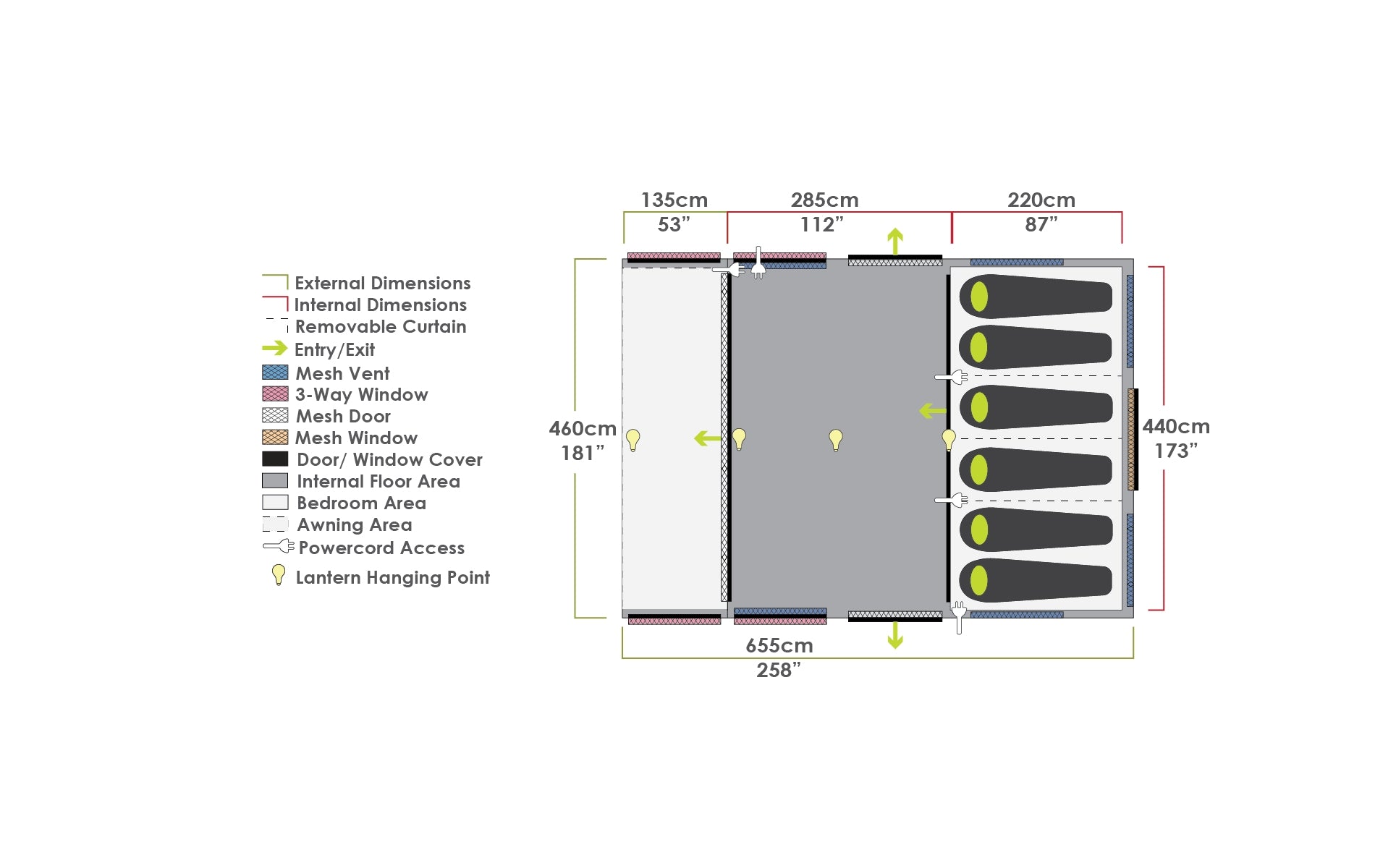 - Optionale SchlafkabineErmöglicht die Umwandlung des Wohnbereichs Ihres Vorzelts in einen zusätzlichen Schlafbereich und bietet gleichzeitig einen internen Wohnbereich. Die Schlafkabine ist separat erhältlich und wird entweder an der linken oder rechten Seite des Vorzelts angebracht.
