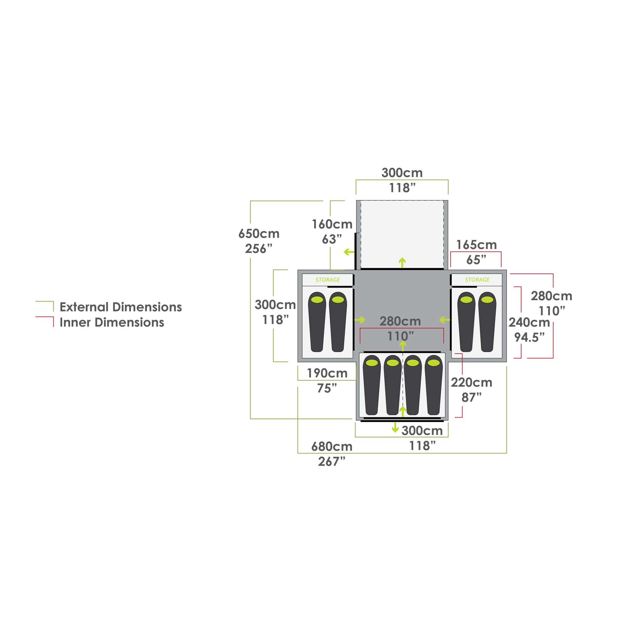 - HAUPTSCHLAFZIMMER IM HECKAusgestattet mit einem Innen- und einem Hintereingang, der die Unruhe im Zelt beim Betreten und Verlassen während der Nacht reduziert. Sorgt außerdem für zusätzliche Luftzirkulation.