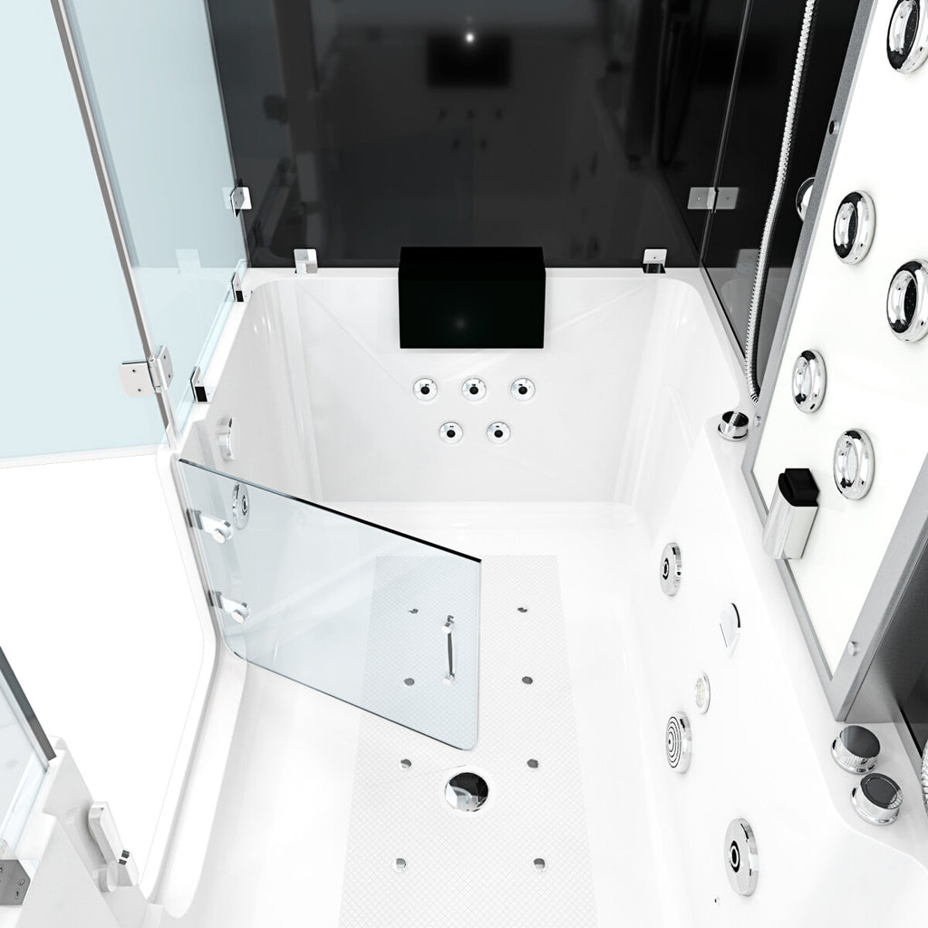 Das Wannenuntergestell besteht aus einer Edelstahlrahmenkonstruktion mit höhenverstellbaren Füßen zum Niveauausgleich. Die zusätzlich verstärkte Tür aus glasfaserverstärktem Sanitär-Acryl mit Spezialdichtung und Sicherheitsverschluss garantiert einen absolut sicheres und dichtes Verschließen der Tür.