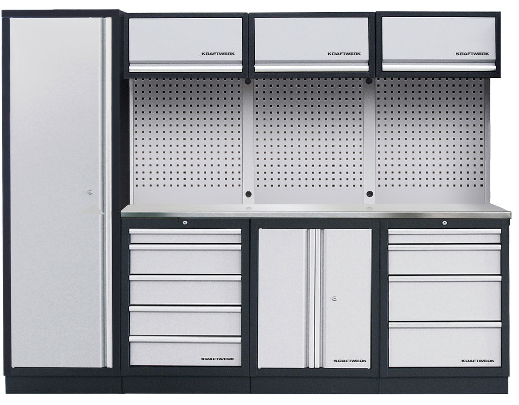 Mit einer Höhe von 2000 mm, einer Breite von 2640 mm und einer Tiefe von 488 mm bietet die KRAFTWERK MOBILIO 4er Kombi großzügigen Stauraum bei gleichzeitig kompakten Abmessungen. Sie passt perfekt in Werkstätten jeder Größe und schafft eine organisierte und effiziente Arbeitsumgebung.