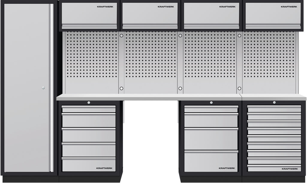 Die KRAFTWERK MOBILIO 5er Kombi bietet Dir ein flexibles, erweiterbares und hochwertiges Ordnungssystem für Deine Werkstatt. Mit seinen vielseitigen Stauraummöglichkeiten, der stabilen Arbeitsplatte und den durchdachten Details wie der Vierkant-Lochwand und den kugelgelagerten Schubladen hast Du alles, was Du für effizientes und strukturiertes Arbeiten brauchst.