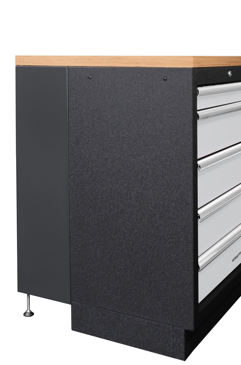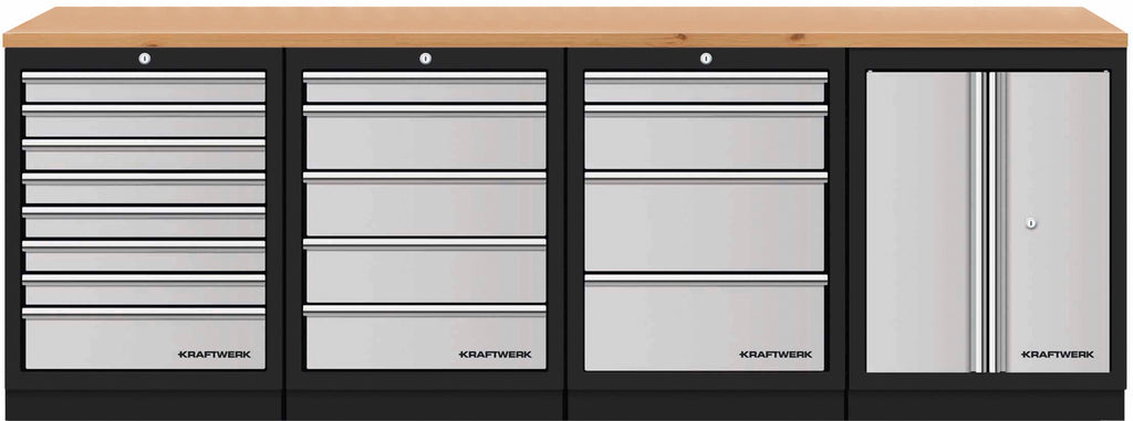 Ob kleine Werkzeuge oder größere Maschinen, die KRAFTWERK MOBILIO bietet Dir mit seinen neun Schubladen und sieben Schränken eine optimale Stauraumlösung. Zwei Hochschränke mit jeweils einer Tür und vier Fachböden schaffen Platz für sperriges Equipment, während der Werkstattwagen-Unterschrank mit sieben kugelgelagerten Schubladen Dir den perfekten Zugriff auf Dein häufig genutztes Werkzeug ermöglicht. Durch die Zentralverriegelung hast Du nicht nur alles sicher verstaut, sondern auch jederzeit im Griff.