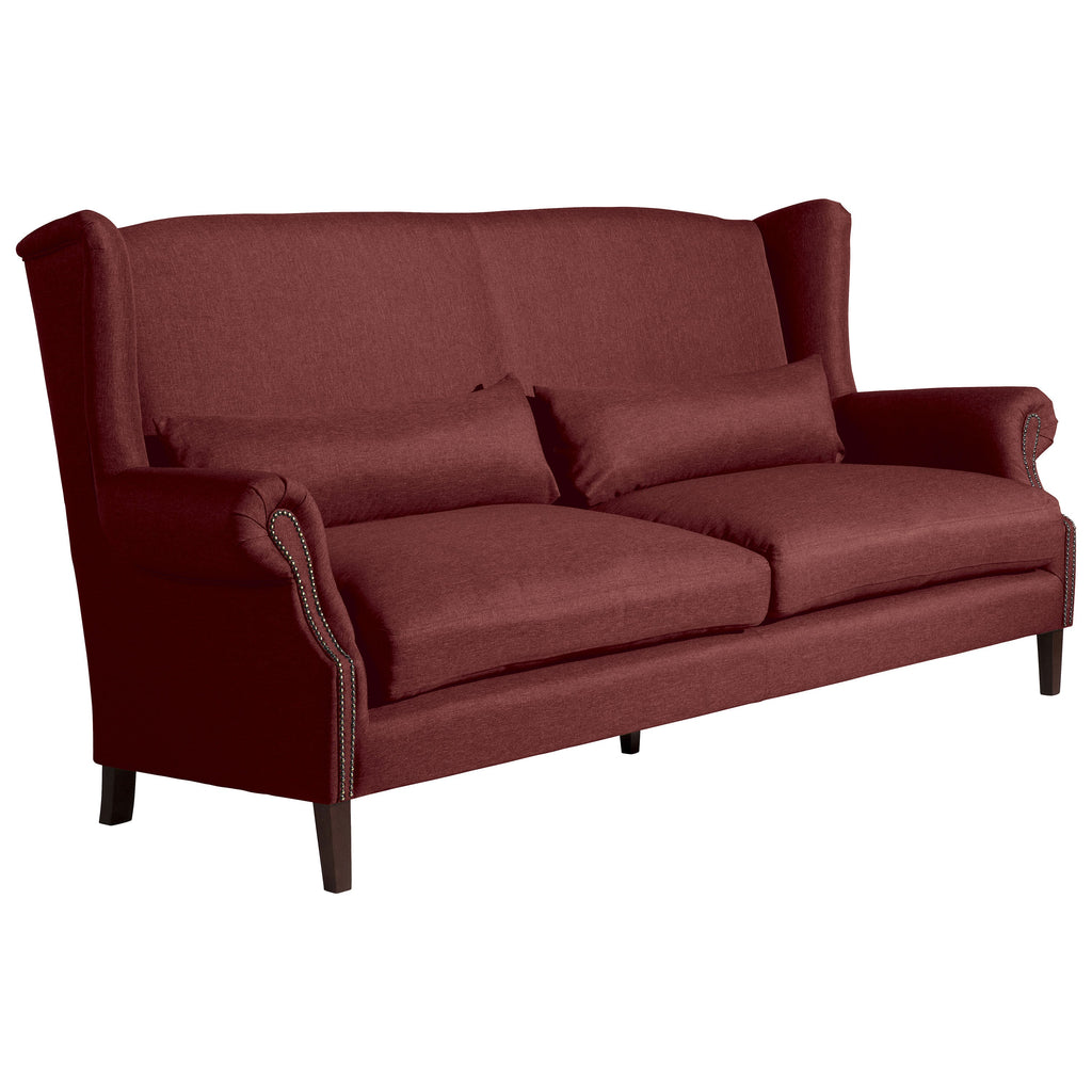 Gemütliches Sofa im Ohrenbackenstil mit vielen aufwändigen Details. Die elegant geschwungenen Armlehnen verfügen über ein dekoratives Ziernagelband. Die losen Sitzkissen mit weicher Schaumstoffflockenfüllung sind mit einem Klettverschluss am Korpus befestigt. Die mitgelieferten Zierkissen sorgen für zusätzlichen Sitzkomfort und unterstreichen die behagliche Optik. Flora ist als 2-Sitzer und 3-Sitzer erhältlich und kann auch um einen passenden Einzelsessel ergänzt werden.
