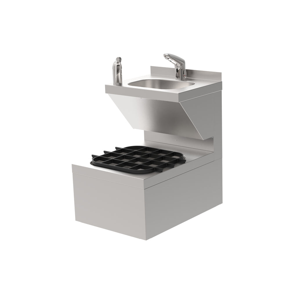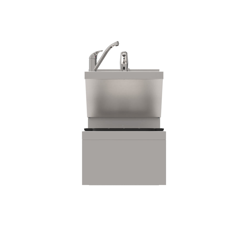 Die praktikable Verbindung aus Handwasch- und Ausgussbecken, mit Einhebelmischbatterie und berührungsloser Armatur in der Wandausführung für ein effizientes, zeitsparendes und hygienisches Arbeiten. Infolge der übereinander angeordneten Becken wird die Umsetzung eines platzsparenden Raumkonzepts ermöglicht. Unterhalb der Abdeckung befindet sich ein Einlegerost aus Kunststoff. Tiefgezogene Becken verhindern die Bildung von Schmutzfugen.