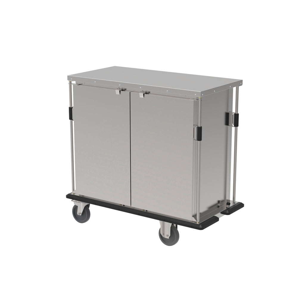 Der Tablettwagen, das optimale Transport- bzw. Verteilprodukt für die Stationsversorgung und ausgestattet für vielfältige anderweitige Einsatzmöglichkeiten. Speisen können vorbereitet werden und zum richtigen Zeitpunkt schnell und einfach serviert werden. Der Wagenboden ist optimal geschützt durch den umlaufenden Stoßschutz aus Vollmaterial PE 500. Eine umfassende Isolierung ist durch den doppelwandigen Schankraum sowie der Türen, dem Dach und dem Boden gewährleistet. Die Mittelwand in offener Rohrkonstruktion für die Aufnahme von eutektischen Kühlplatten im GN-Maß. Das Tauwasser wird über nach hinten geneigte Aufnahmebleche in einen Tauwasserablauf geführt und in einer herausnehmbaren Tauwasserschale am Boden gesammelt.