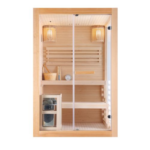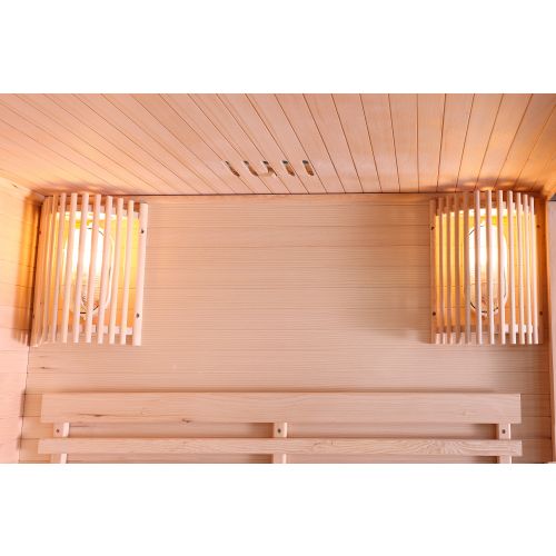 Zwei stilvolle Lampen tauchen den Innenraum in warmes Licht, während das hochwertige Hemlock-Holz für natürliche Wärmeisolierung und ein angenehmes Raumklima sorgt. Die 6 mm starke Sicherheitsglas-Front unterstreicht das moderne Design und verleiht der Kabine ihren charakteristischen Panorama-Look.