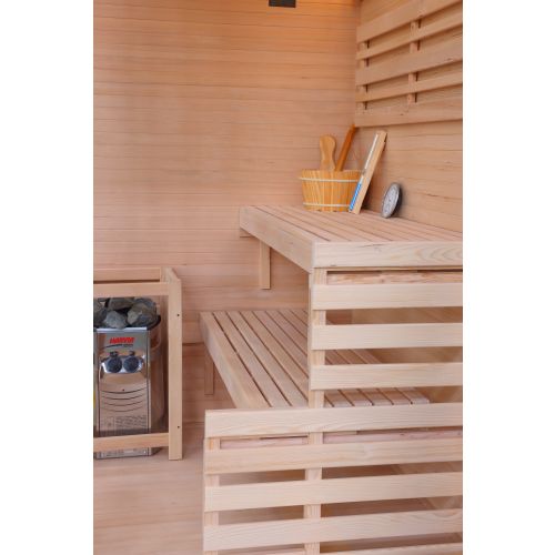 Der leistungsstarke Harvia Saunaofen mit 3,5 kW und den mitgelieferten Saunasteinen sorgt für intensive, gleichmäßige Wärme. Über die integrierte Lüftung lässt sich das Raumklima individuell anpassen – für wohltuende, gesunde Saunagänge.