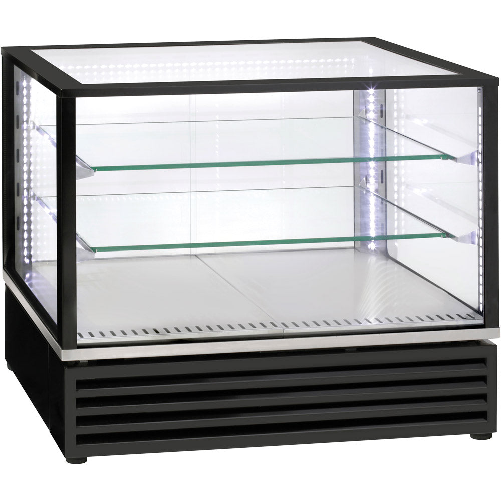 Mit dieser Kühlvitrine setzen Sie Torten, Dessert, Obst und andere empfindliche Speisen von allen Seiten gekonnt in Szene.Eine gleichmäßige, sanfte Luftzirkulation kühlt Ihre empfindlichen Produkte, ohne diese auszutrocknen. LED-Lichter an den Seitenkanten sorgen für die Ausleuchtung.Die zwei Glasböden können Sie nach Bedarf vierfach in der Höhe verstellen.Die Vitrine ist rundum zweifach verglast, arbeitet in einem Temperaturbereich von +2 bis +10 Grad und der elektronische Thermostat ermöglicht eine automatische Abtauung alle 2 Stunden.
