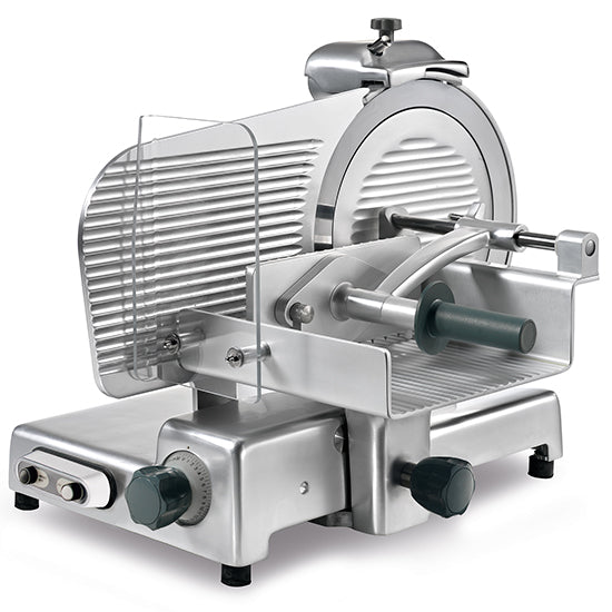 Abgerundete Linie ohne Kanten und sichtbare Schrauben. Verchromter, geschliffener und geläppter Gleitzapfen. Gleitbuchsen aus Gusseisen, geläppt. Stoßschutz auf Wagen aus vulkanisiertem Gummi. Abnehmbarer,Segelhalterdeckel, Scheibenhalter aus Edelstahl mit Bajonett Schnelleinspannung. Alle Kleinteile aus Edelstahl. Untere Abdeckung, direkter Zugang zu den elektrischen Komponenten. Umschaltbare elektronische Karte 110-220-380 V Einphasenstrom/ Drehstrom. Schleifvorrichtung mit unterem Schutzbehälter. Dichtsystem auf Riemenscheibe. 48 mm Abstand zwischen Klinge und Kopf. Serienmäßiger Schneideblattabnehmer. Plastikhandgriffe, Gummifüße. Druckknöpfe IP 67 aus Plastik. VCO. Besonders auf den nordischen Märkten gefragt. Wanne zum Schneiden für alle Produkte, abnehmbarer Blockierer aus Aluminium. Bügel mit Stahlnägeln und gefräste Zähne auf der Messerseite. Auch mit bewegbaren Halter erhältlich.