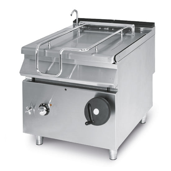 Seitenwände, Boden und Rückseite aus Edelstahl. Hinterer Kamin aus emailliertem Gusseisen. Bratpfannen aus Edelstahl und Boden aus AISI 304. Klappdeckel aus Edelstahl. Manuelles Kippsystem. Automatische Wasserbeladung per Druckknopf. Fester Wasserhahn oben. Beheizung durch Heizelemente, die direkt unterhalb des Kesselsbodens platziert sind. Temperatureinstellung von 100°C bis 285°C über einen an den Schalter angeschlossenen Thermostat. Sicherheitsthermostat. LEDs zeigen die korrekte Funktion des Geräts an. Speziell designte Knöpfe, um das Eindringen von Wasser in das Bedienfeld zu vermeiden. Ausgestattet mit niedrigem Kamin.